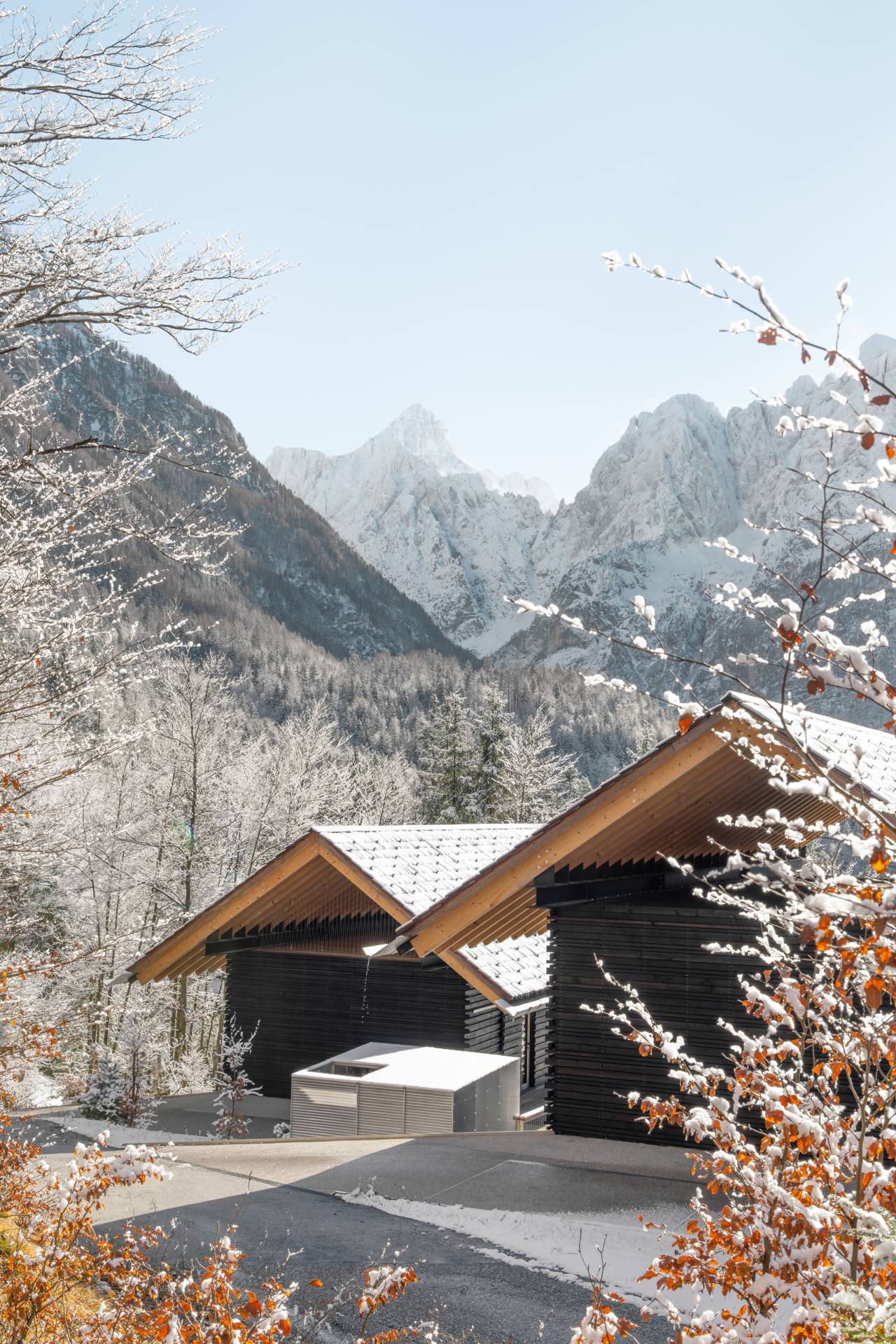 Na ivici Triglavskog nacionalnog parka, iznad jezera Jasna kod Kranjske Gore, slovenački studio osmislio je dve planinske kuće koje spajaju tradiciju i savremenost. Unutrašnjost je oblikovana tako da pruža osećaj topline i domaće alpske gostoljubivosti, dok veliki panoramski prozor i fleksibilan nameštaj brišu granicu između unutrašnjeg prostora i prirode.