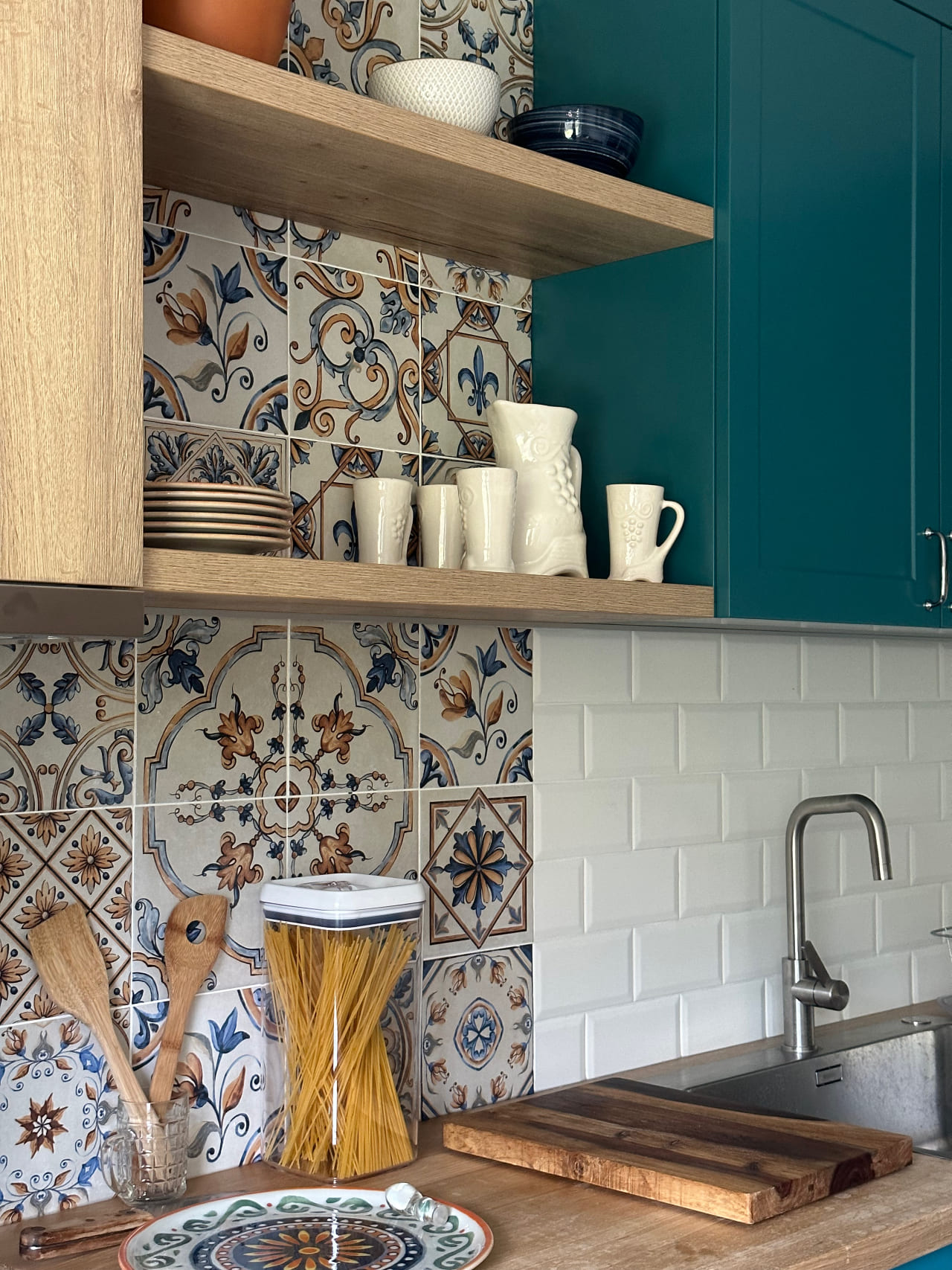 “Korišćene su italijanske pločice Tuscany Decoro 20×20, koje svojim ornamentima i bojama unose živost i autentičan karakter prostora”, otkriva autorka i dodaje da su kombinovane sa vanvremenskim klasikom – belim “subway” pločicama, čime je postignut balans između dekorativnosti i jednostavne, urbane estetike.