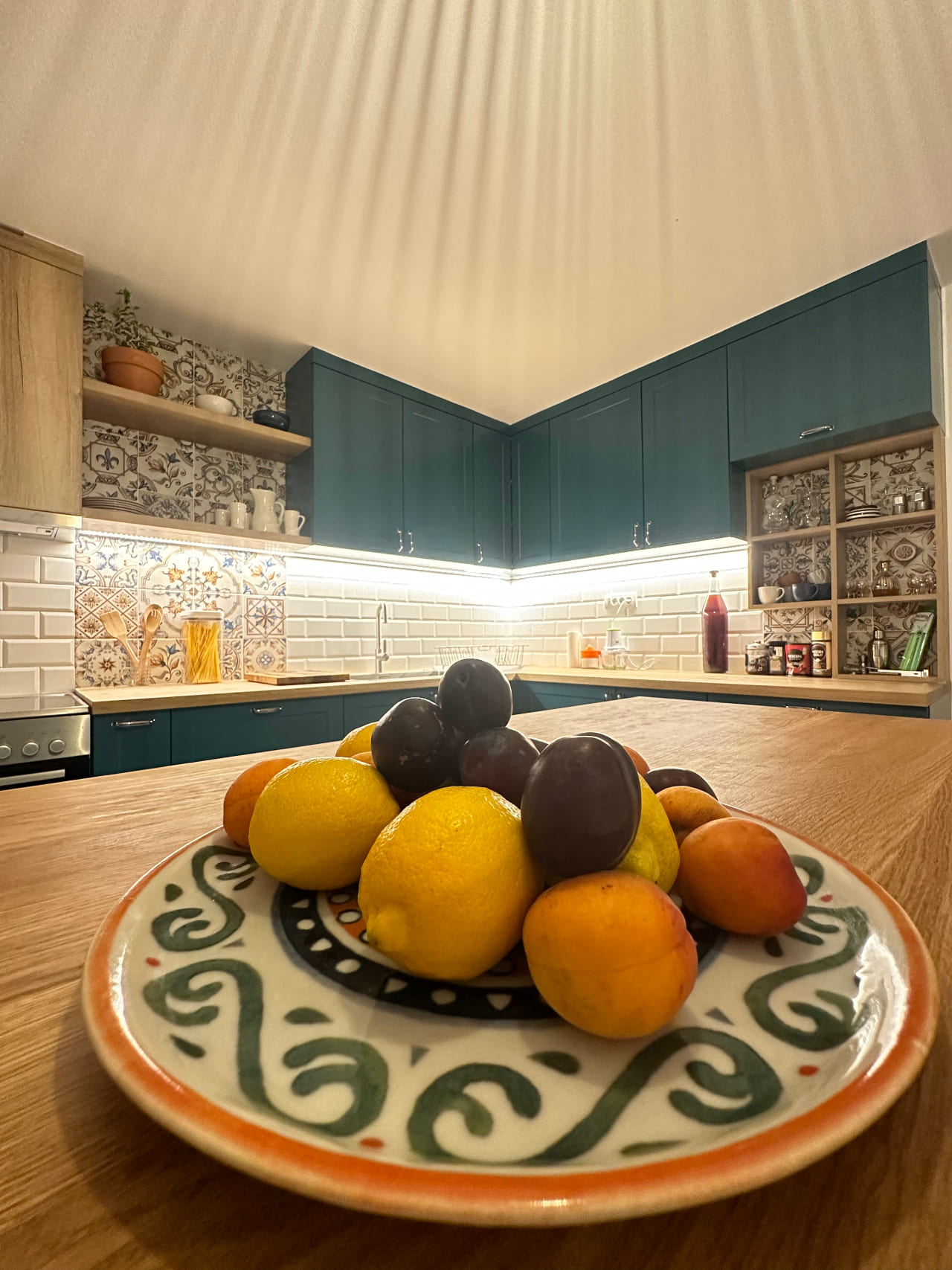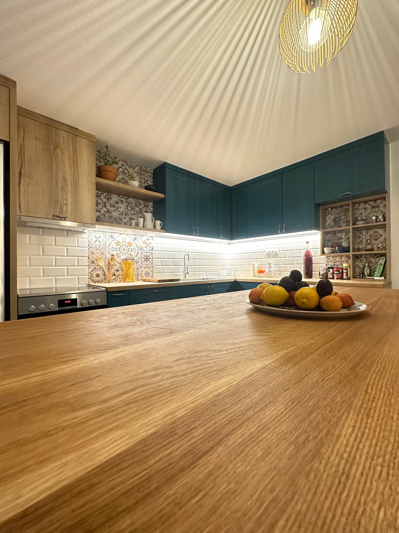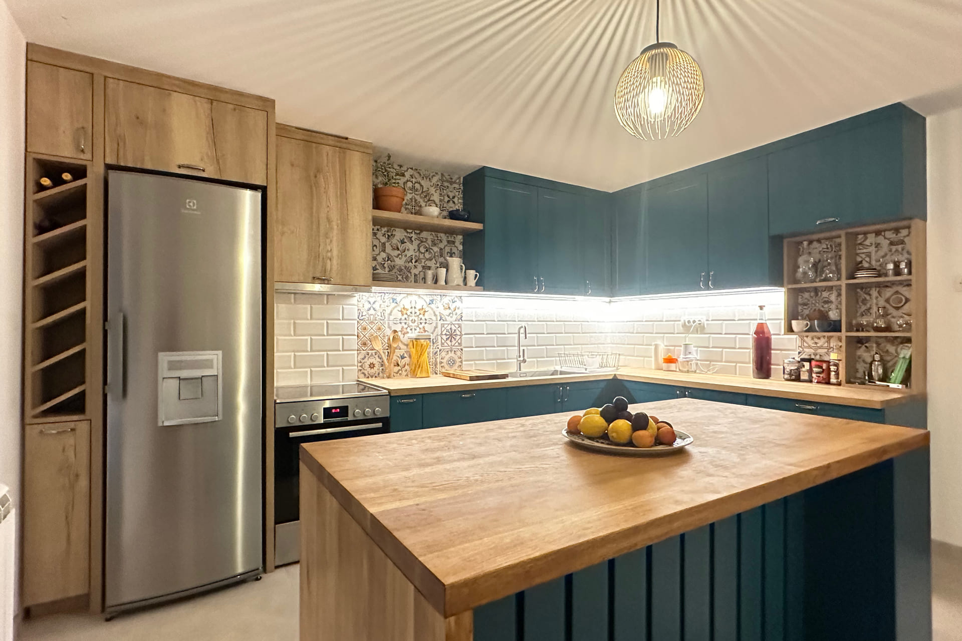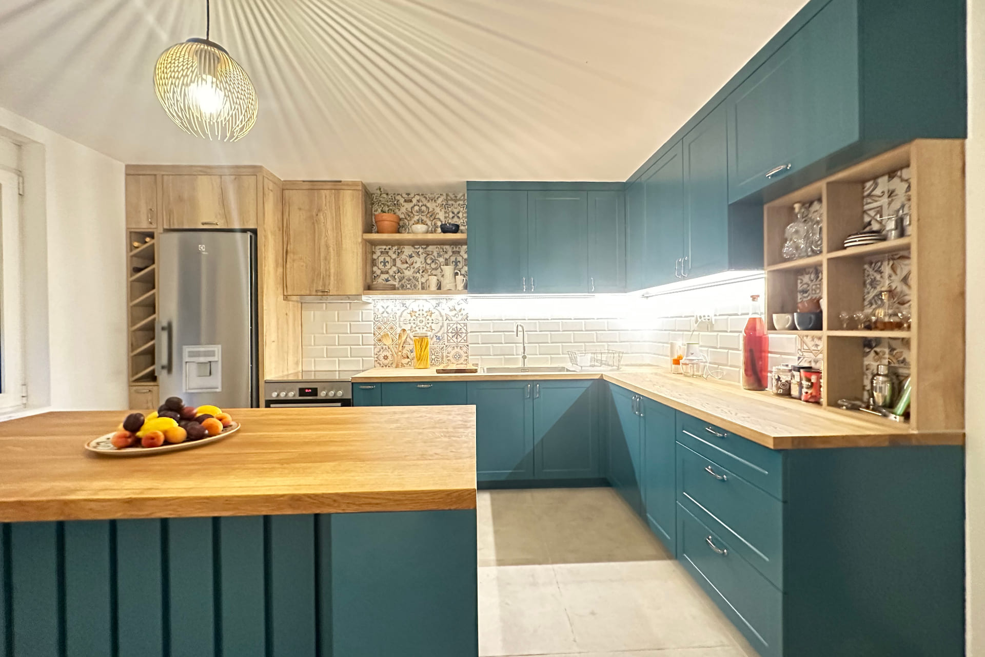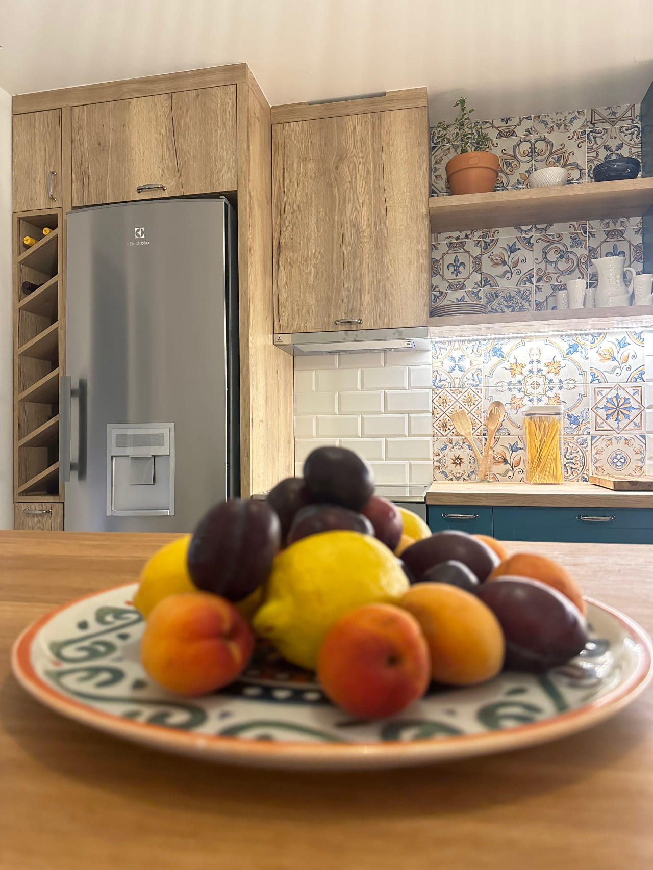 Kombinacijom funkcionalnog rasporeda, toplih prirodnih materijala i živopisnih mediteranskih akcenata, ova kuhinja postala je srce kuće, odnosno centralno mesto svakodnevnog okupljanja.