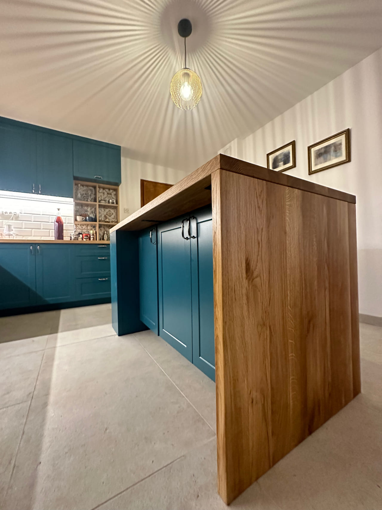 Kuhinjski frontovi izrađeni su od farbanog MDF-a sa ramom, u dubokoj tirkizno-zelenoj nijansi koja prostoru daje karakter i dubinu.