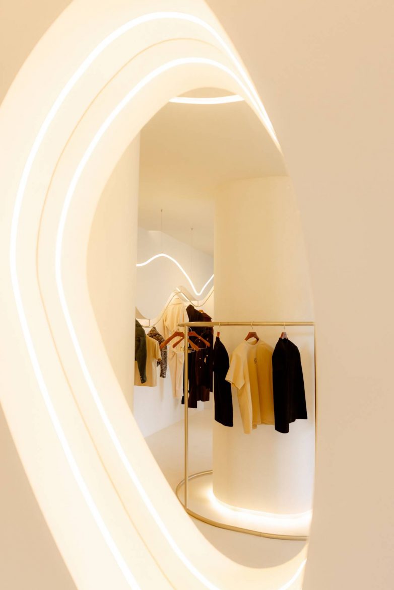 Ovaj tok kretanja prate fluidne forme i meke linije, koje su istovremeno inspirisane i modnim stilom brenda. Kako kaže arhitektkinja, „nesimetrične i fluidne forme prate fluidnu funkciju koja pruža korisniku udobnost„.
