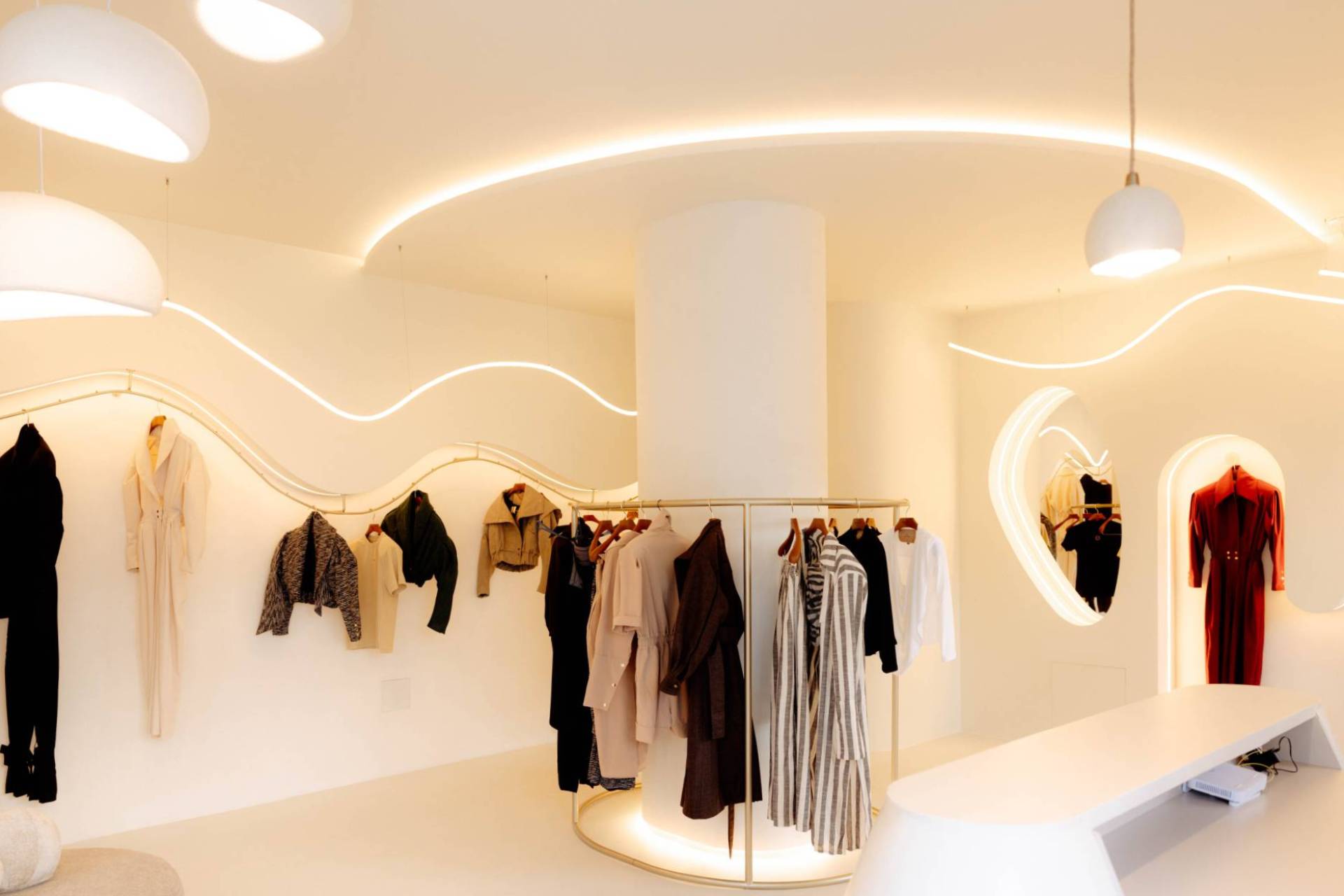 Arhitektkinja je oblikovala prostor oko kružnog toka kretanja, koristeći organske linije, fluidne forme i osvetljenje koje drži fokus na garderobi. Rezultat je enterijer koji deluje intuitivno i potpuno podređeno modnom izrazu brenda.