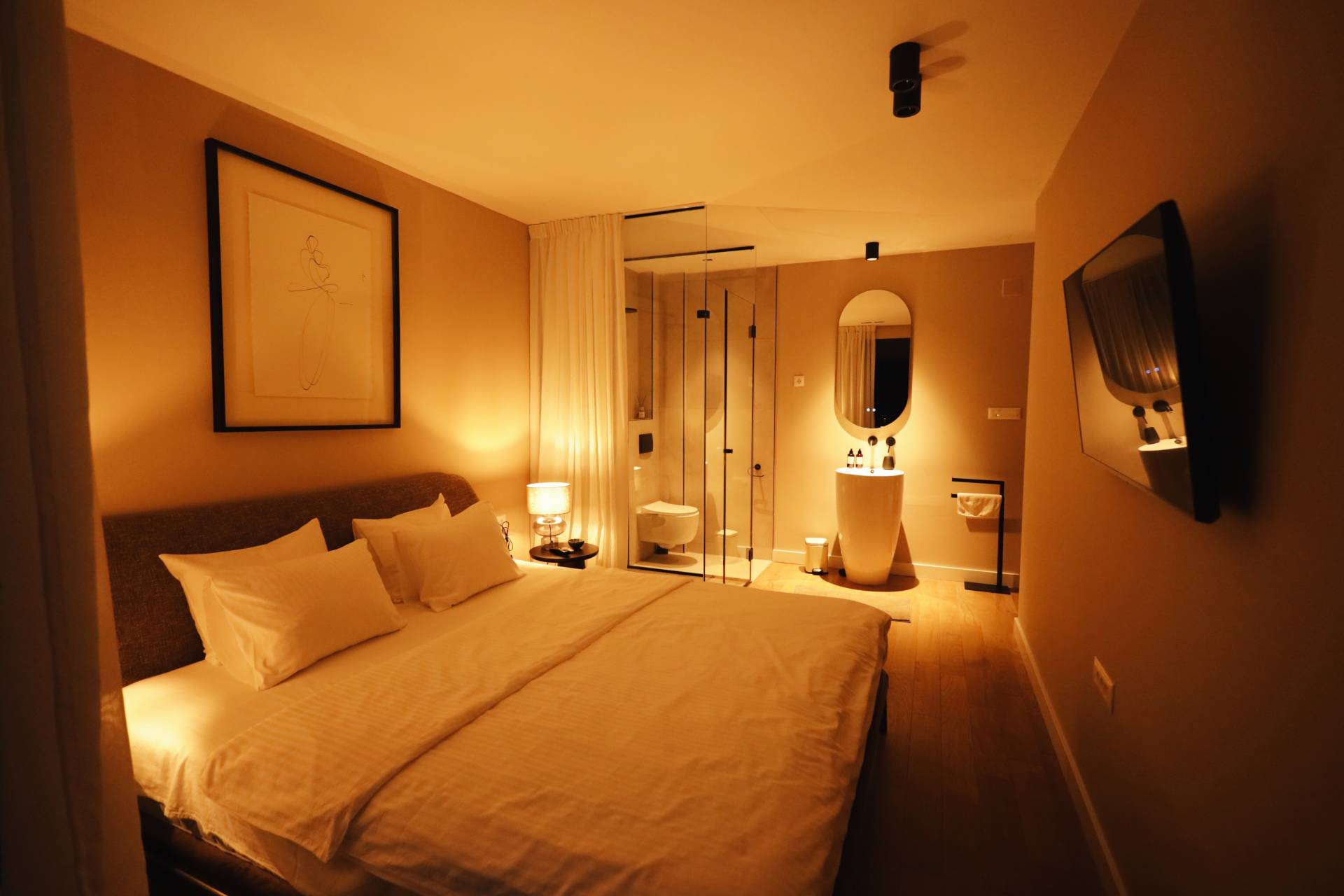 Svaka od tri sobe i odvojenih kupatila ima svoj mir, svetlo i energiju, dok tonovi, materijali i mirisi zajedno stvaraju ambijent koji ne stimuliše čula agresivno, već ih umiruje.