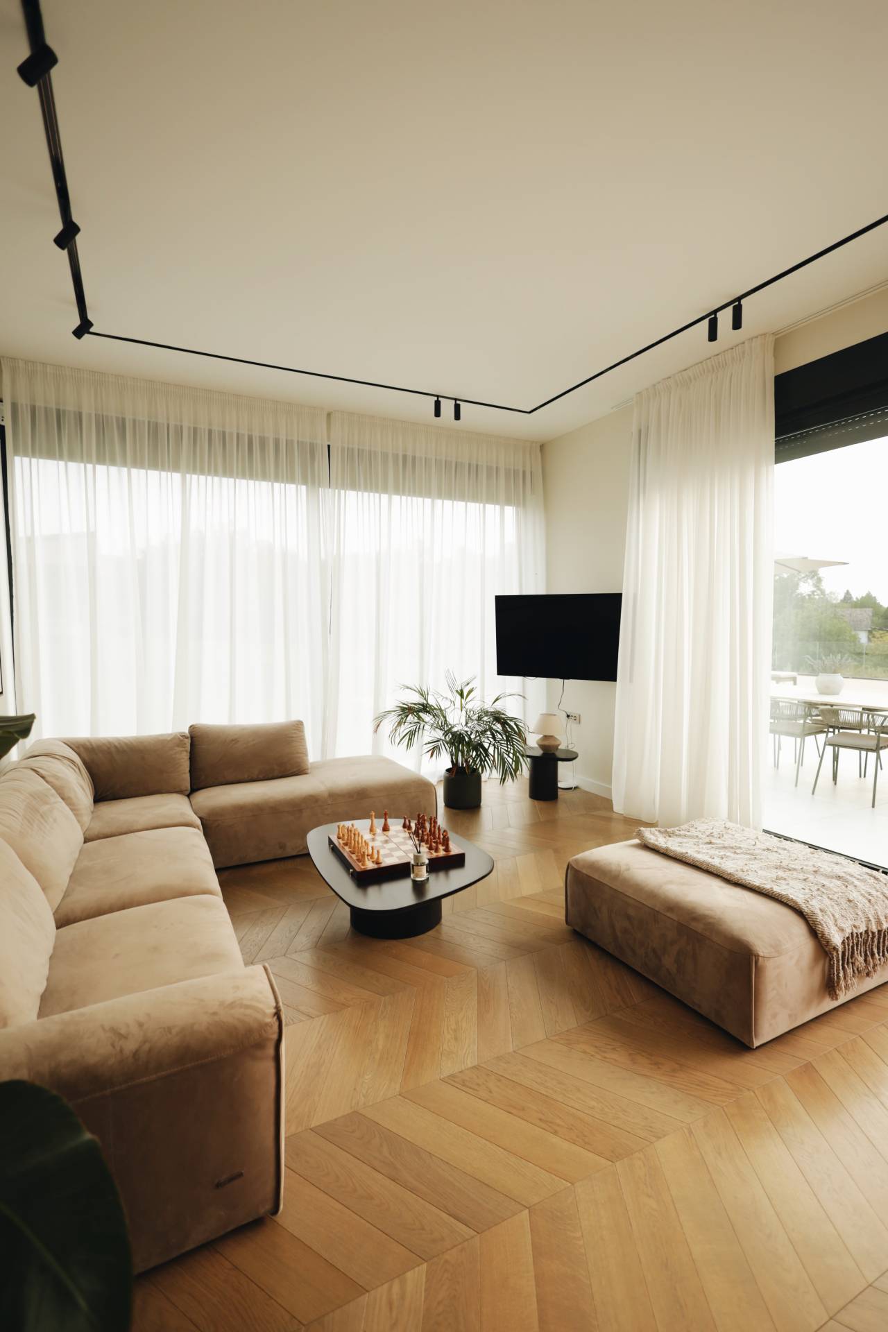 Enterijer je obložen ševron parketom, dok su centralne površine izrađene od travertina. Prirodni materijali, pamuk i drvo u zemljanim tonovima stvaraju osećaj mekoće i prisnosti, dok prostor funkcioniše u tihoj ravnoteži između prirode i arhitekture.