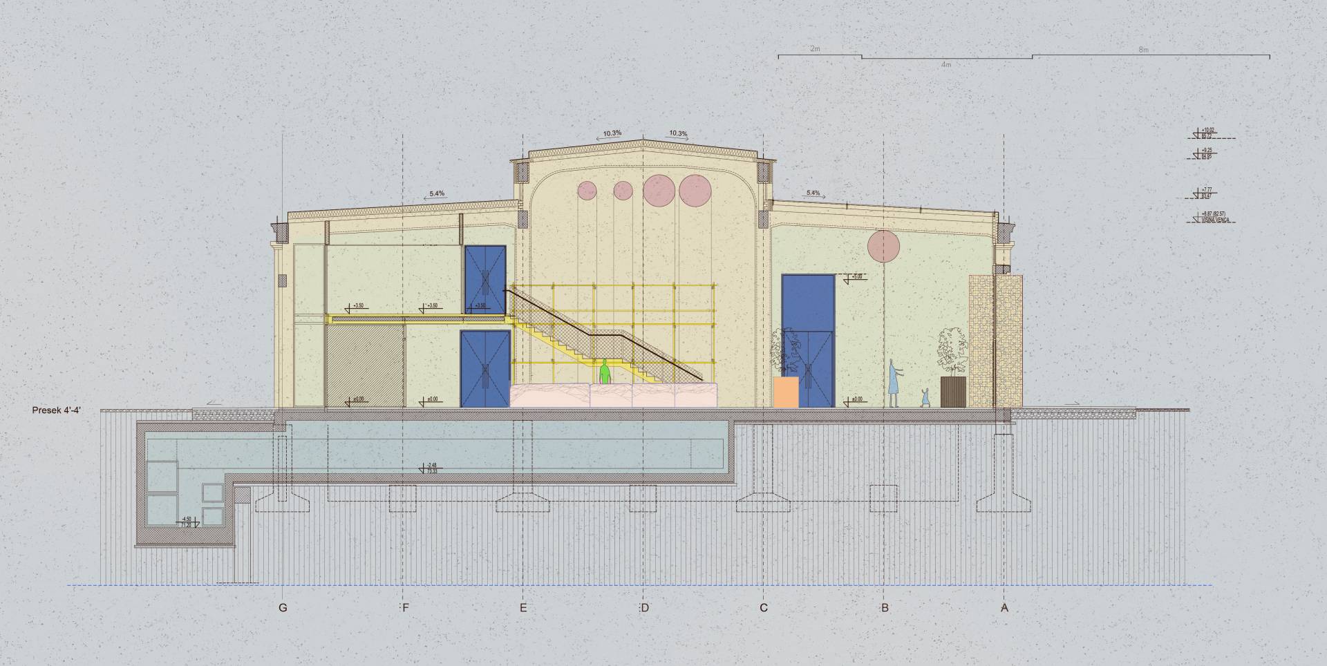 „Koristili smo tri osnovne boje: plavu, žutu i crvenu, kako bismo naglasili podelu po zonama: plava za multifunkcionalnu dvoranu, žuta za glavni hol i prostore za rad, a crvena za konferencijsku salu“, pojašnjavaju dodatno.