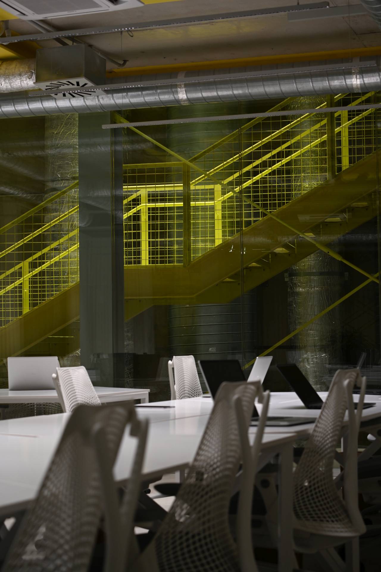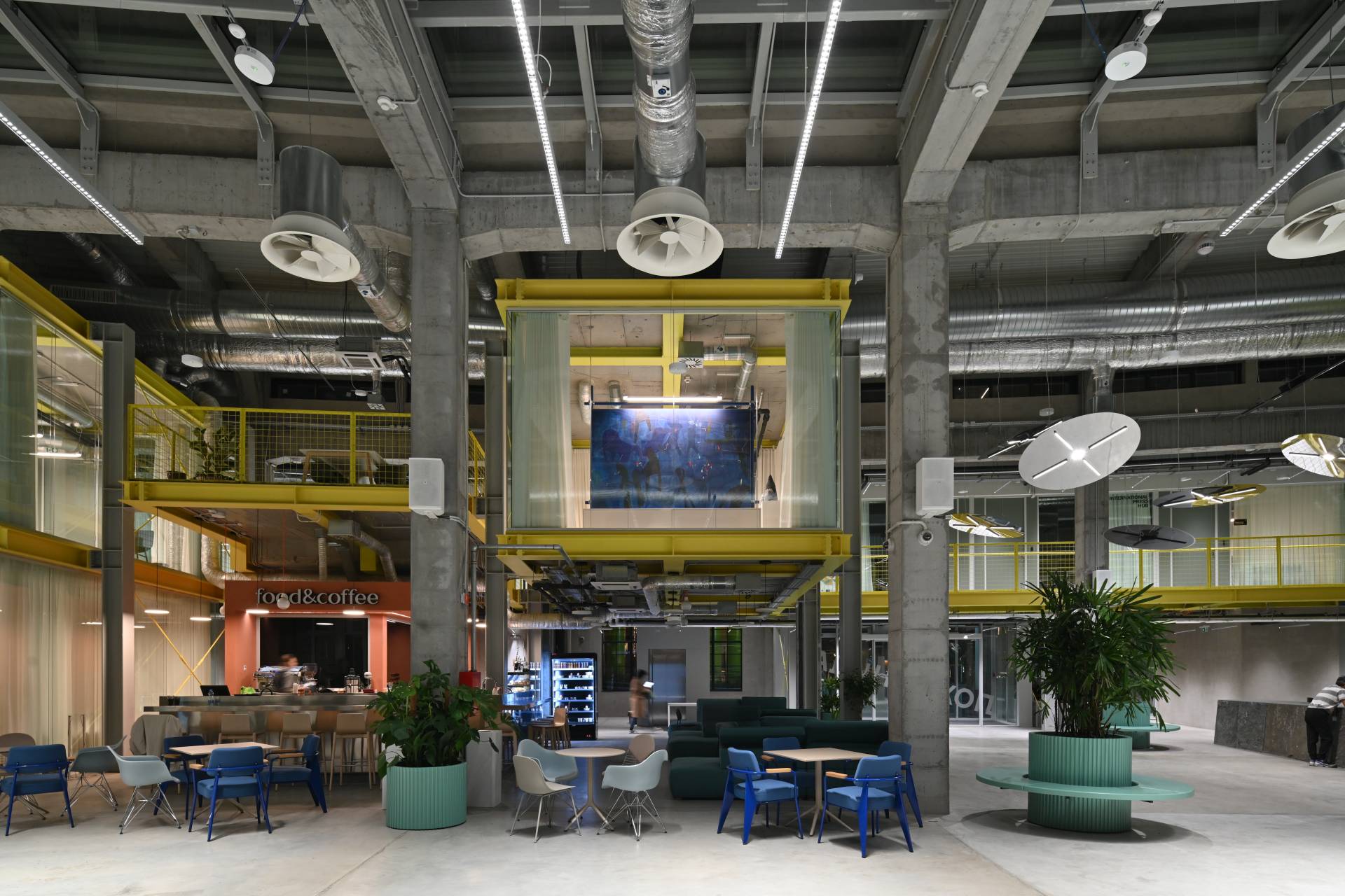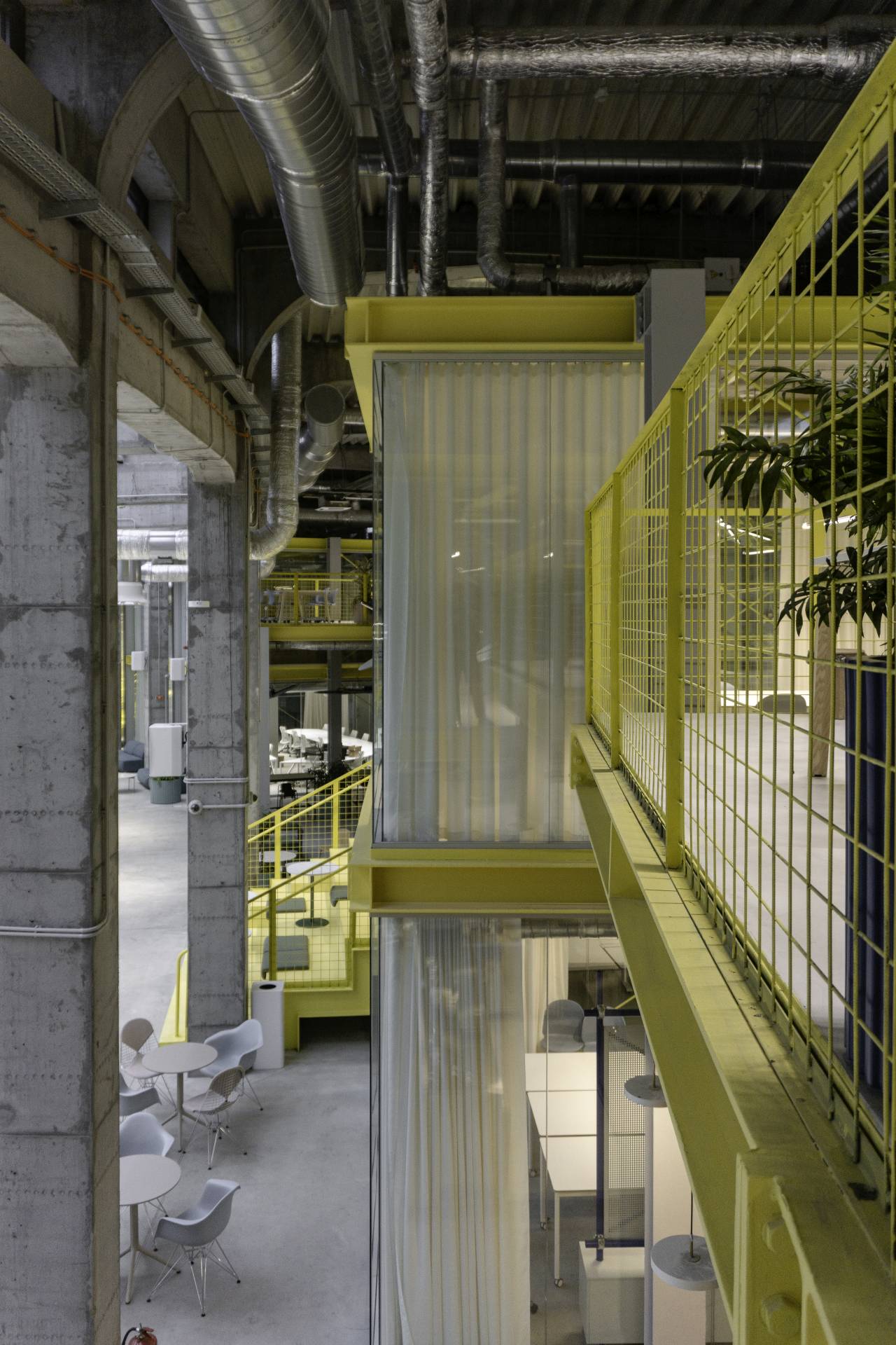 Polazna tačka u oblikovanju enterijera bila je iskrenost i slojevitost materijala: „Želeli smo da konstrukcija ostane vidljiva, da materijali govore sami za sebe. Beton, čelik i staklo postali su poveznica između starog i novog sloja arhitekture.“