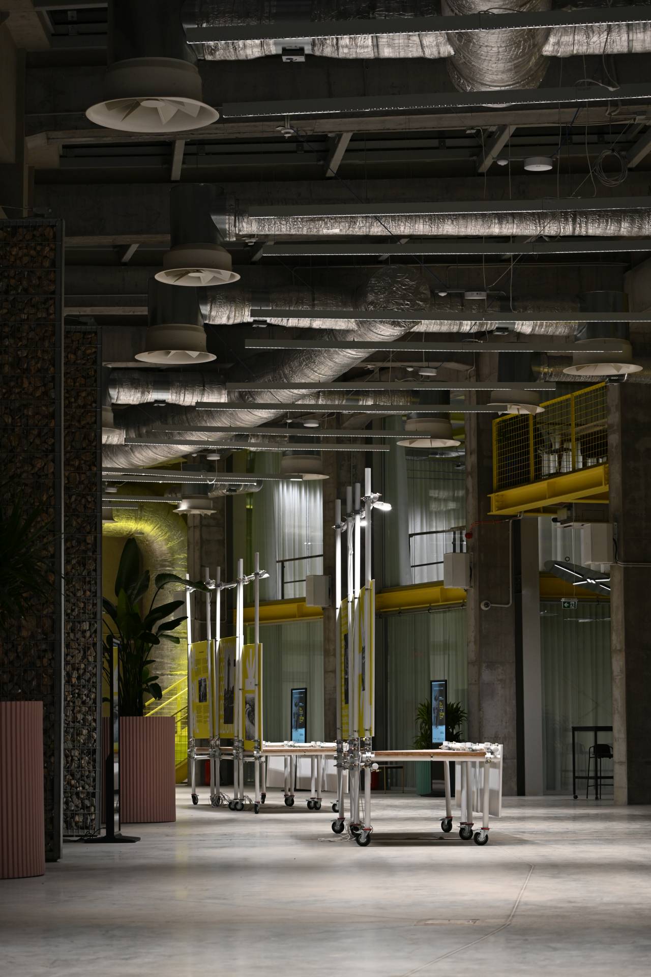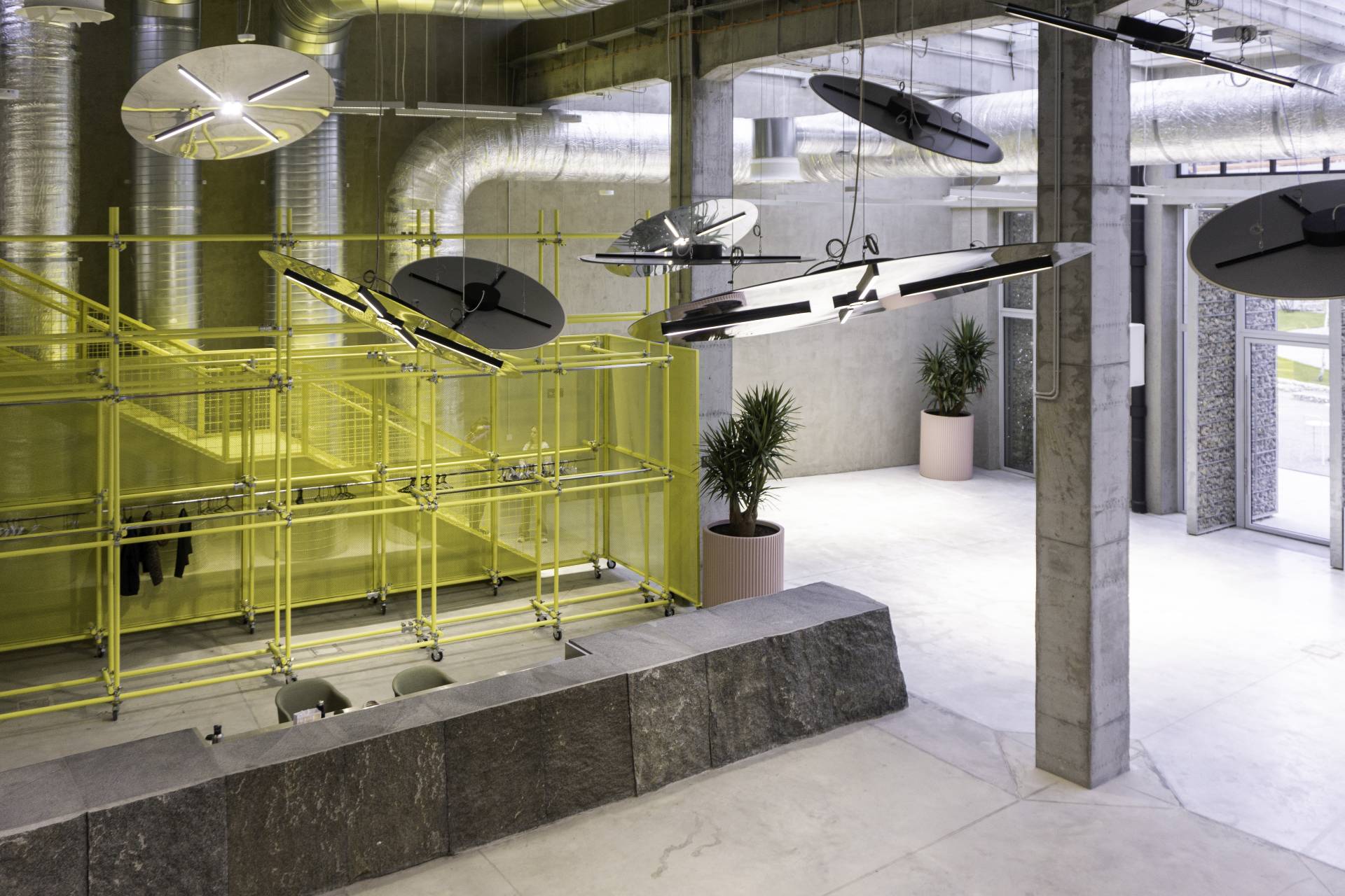 Od kamenog pulta u ulaznom holu, preko garderobe, do izložbenih sistema u formi čeličnih skela, svaki element ima svoju ulogu u građenju identiteta prostora.