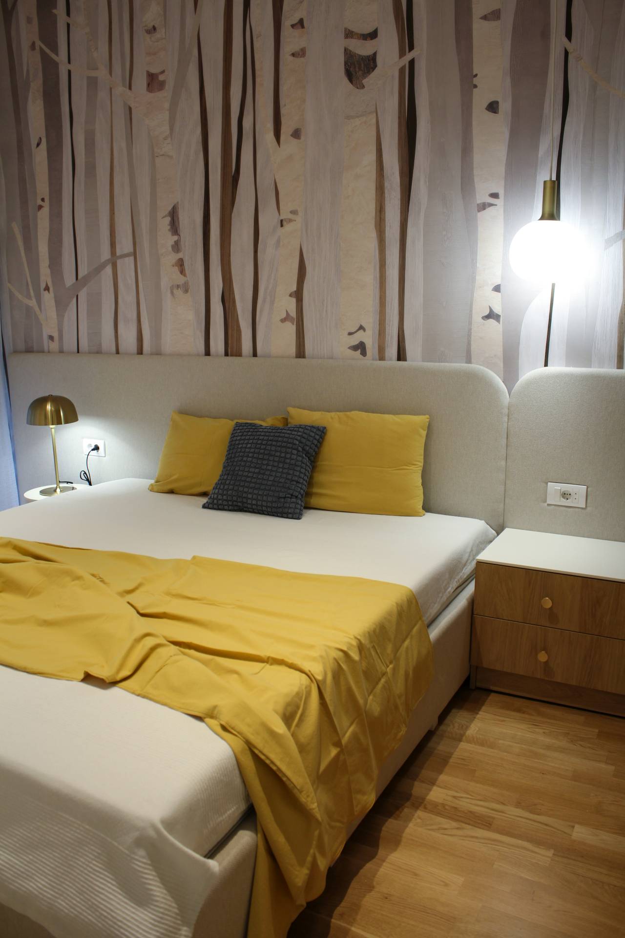 Dugačko uzglavlje povezuje noćne ormariće, krevet i plakar u jednu celinu, dok tapeta na zidu postaje lajtmotiv za izbor boja i materijala u ostatku stana. Asimetrična forma uzglavlja unosi dinamiku i čini da mali prostor deluje zanimljivije.