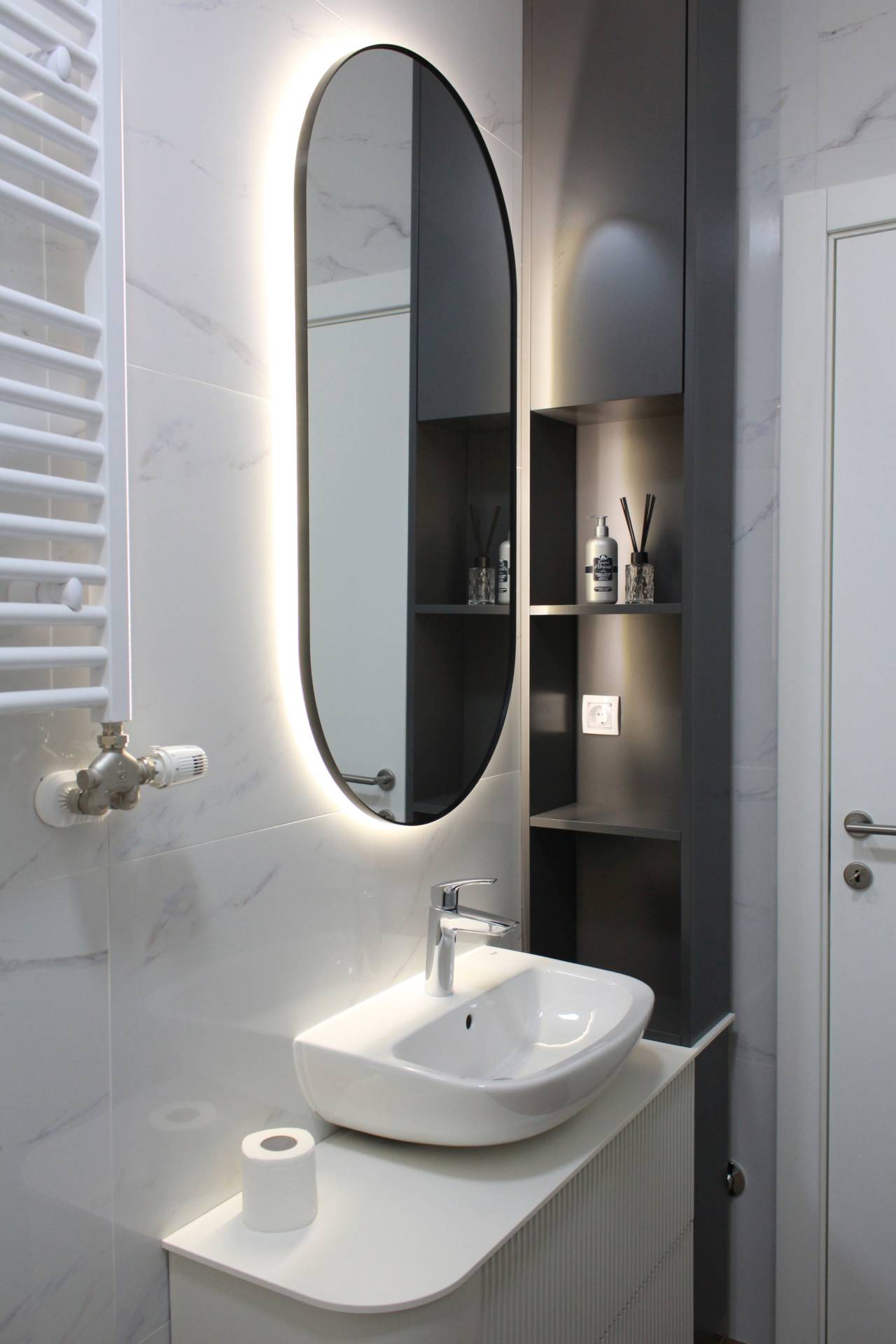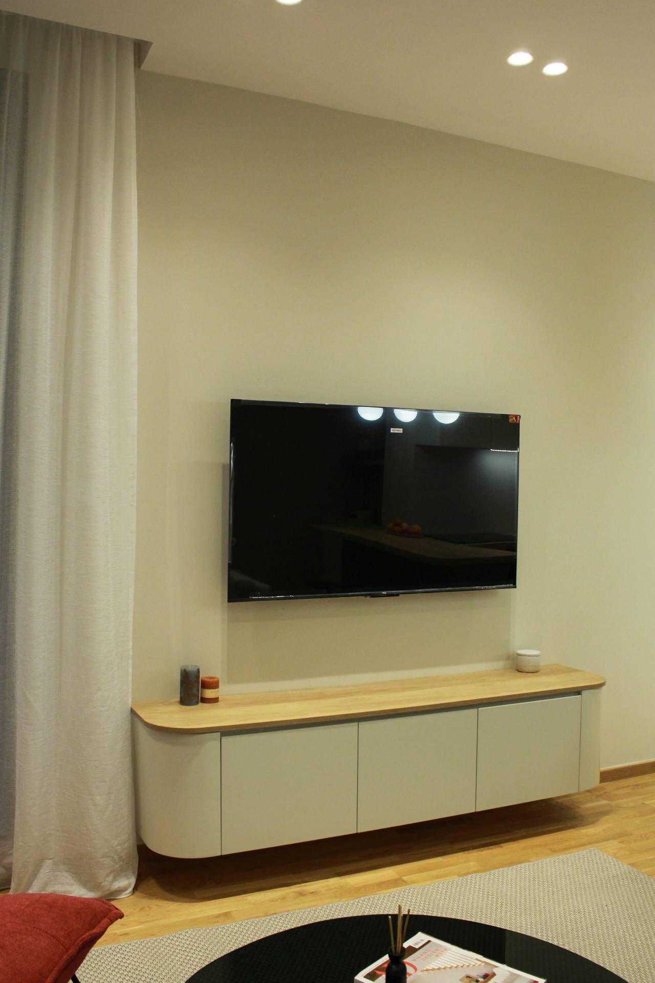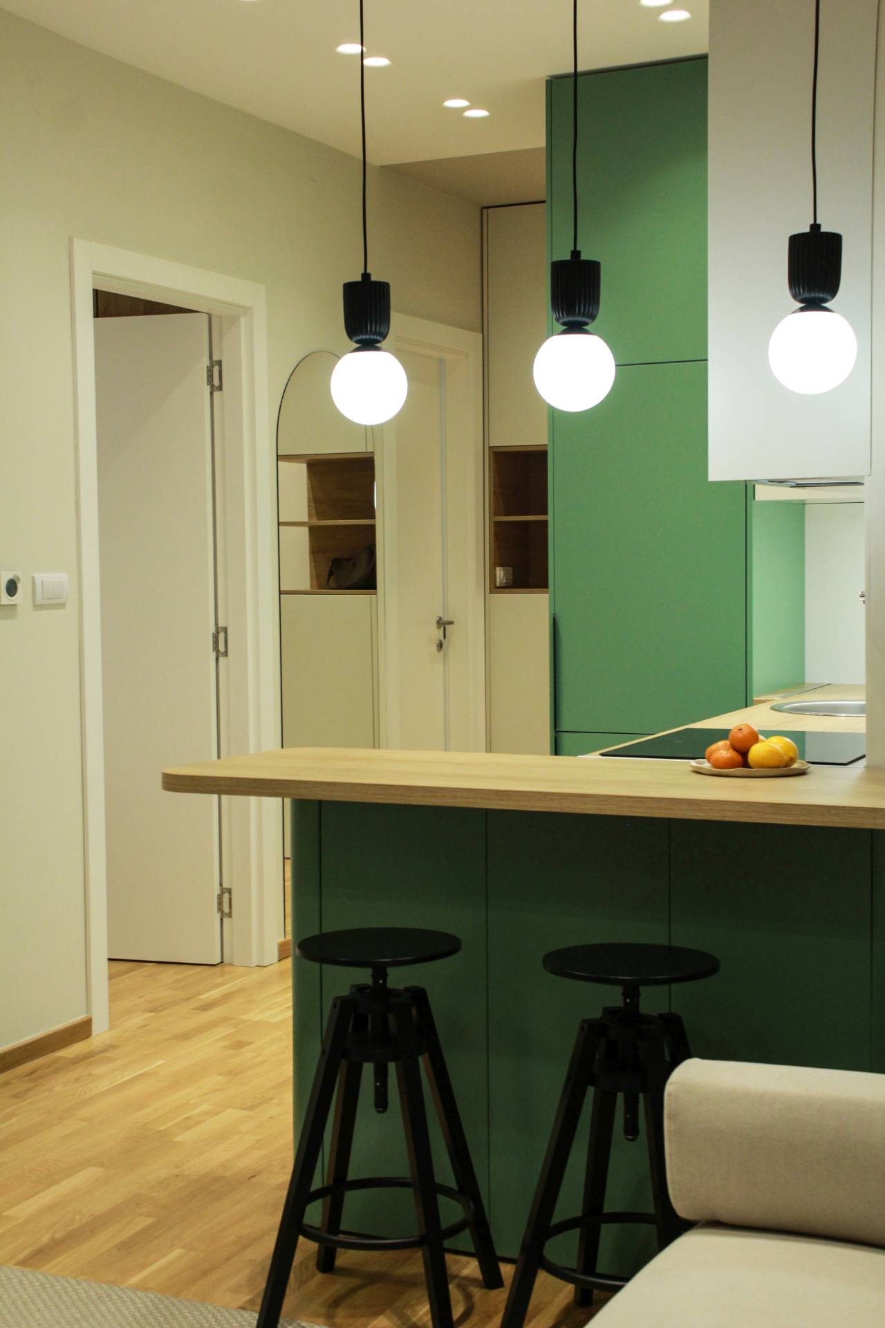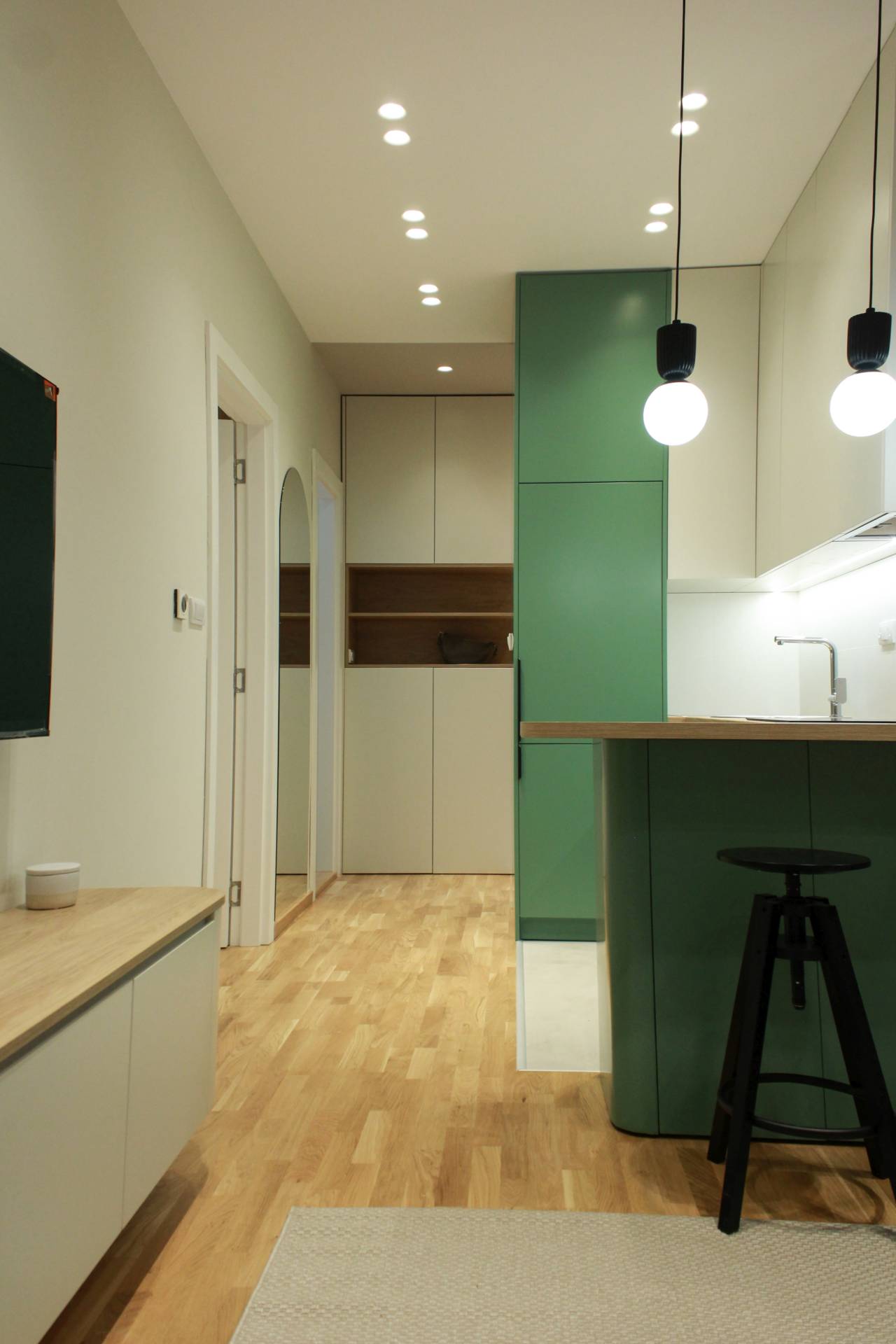 Zaobljene forme strateški su postavljene na mestima prolaza, kako bi olakšale kretanje. Taj motiv se ponavlja kroz detalje – frontove od profilisanog MDF-a, uzglavlje kreveta u spavaćoj sobi, ogledalo u predsoblju – čime se postiže vizuelna povezanost celog enterijera.