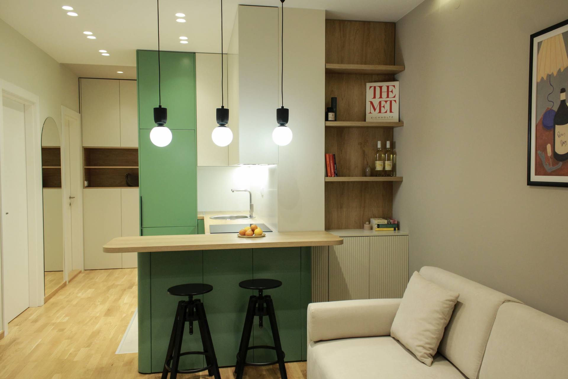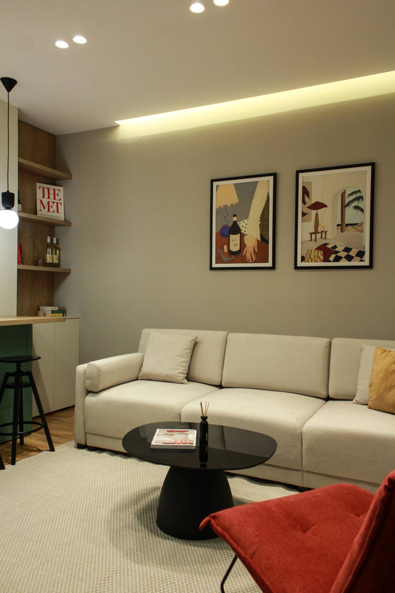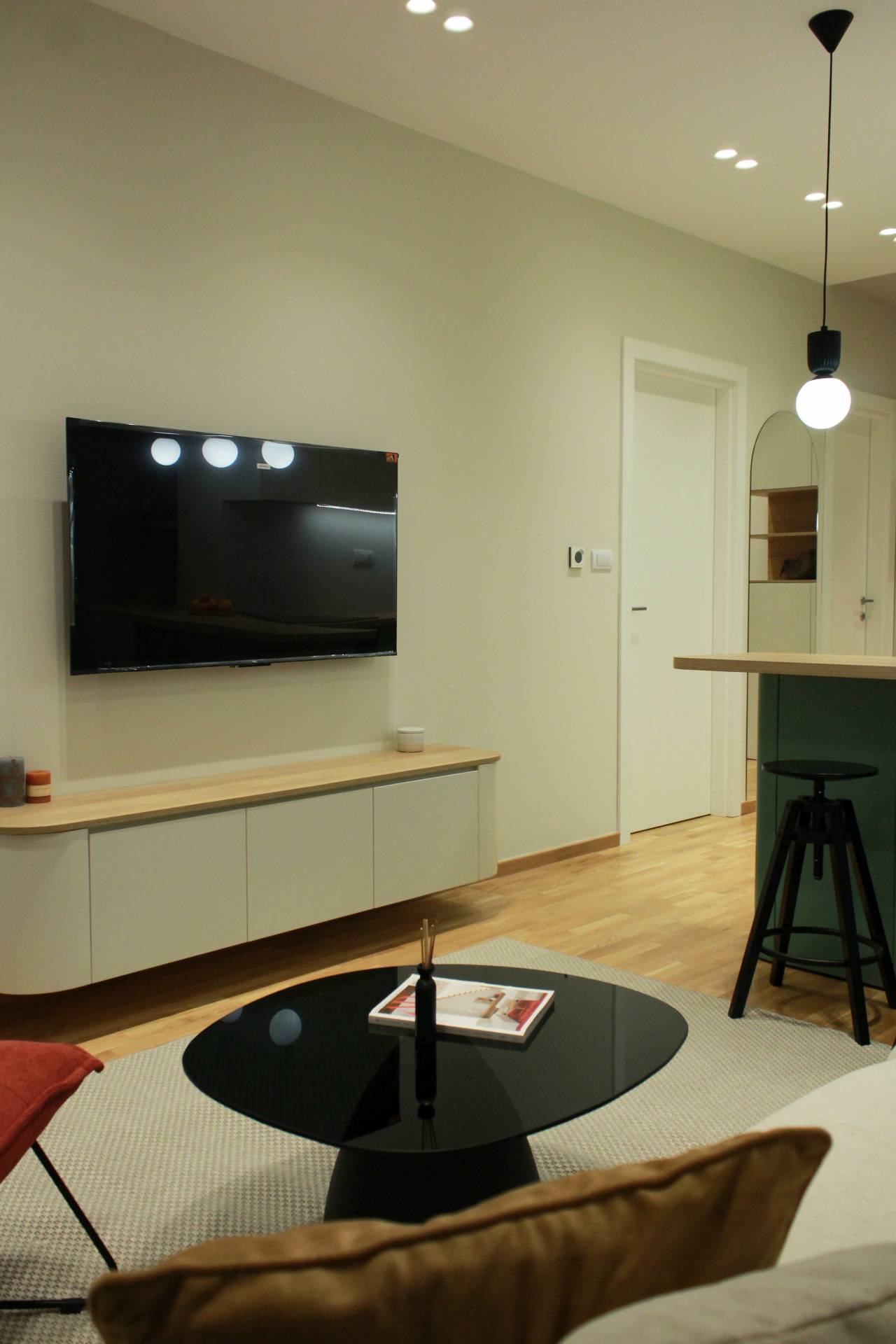 U konkurenciji stanova za izdavanje, presudni su detalji koji ostaju u sećanju. U ovom slučaju to su zaobljene forme, akcentne boje, jasno definisana zona šanka i spavaća soba sa hotelskom logikom organizacije.