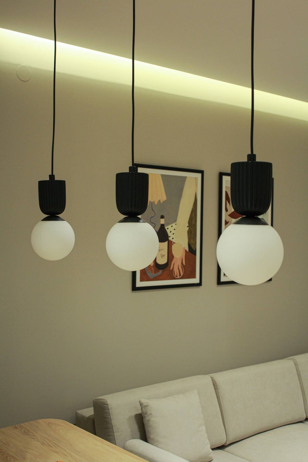 Otvorena dnevna zona organizovana je oko šanka koji fizički razdvaja kuhinju i dnevni boravak. Kako zauzima centralnu poziciju, dodatno je naglašen visilicama koje postaju važan vizuelni akcenat prostora.