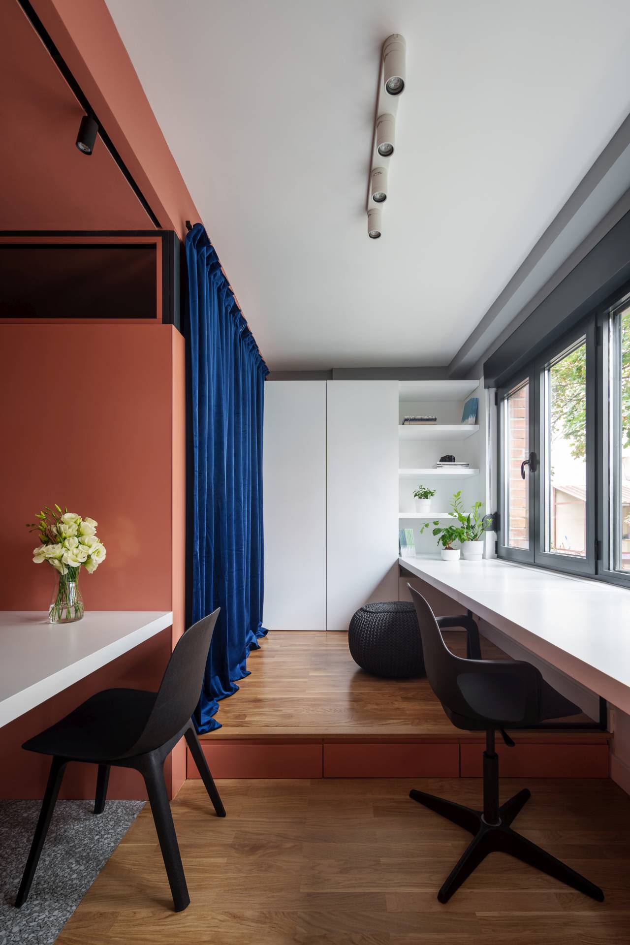 Hrabra upotreba boje u enterijeru male površine deluje osvežavajuće, dok pametna organizacija, sa akcentom na obilje prostora za odlaganje, pravi balans između funkcionalnosti i vizuelne lakoće.