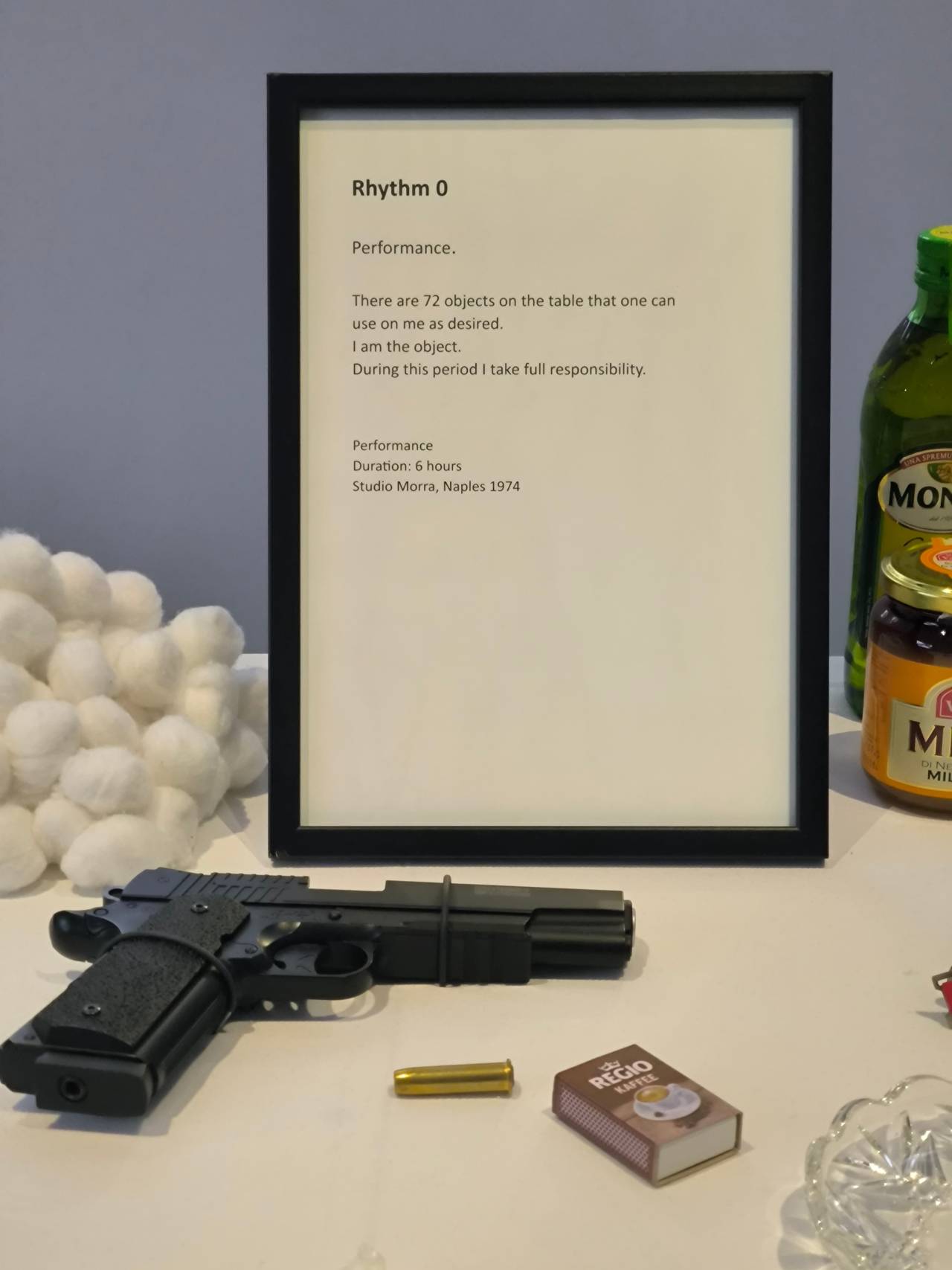 Međutim, prava katarza dešava se kada pristupite stolu gde su položeni predmeti (njih čak 72) koji su bili sastavni deo ovog šestočasovnog perfomansa, namenjeni da umetnici pruže zadovoljstvo ili bol i ostavljeni svakome u publici da ih upotrebi po sopstvenom nahođenju.