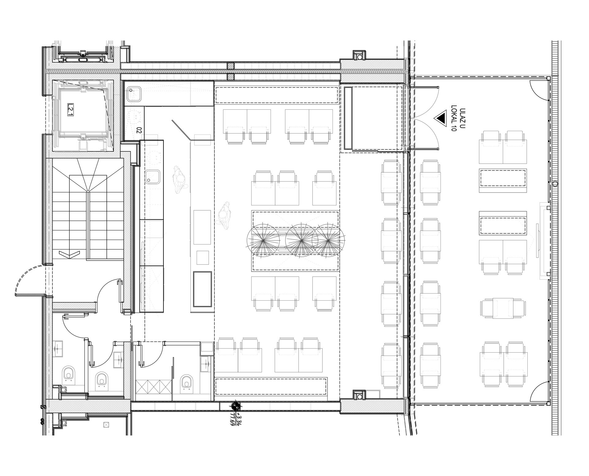 Pre svega, organizacija prostora se ogleda u simetriji sedenja. Monolitni, veliki šank je pozicioniran paralelno sa staklenim izlogom, tj. fasadom u zadnjoj zoni prostora.