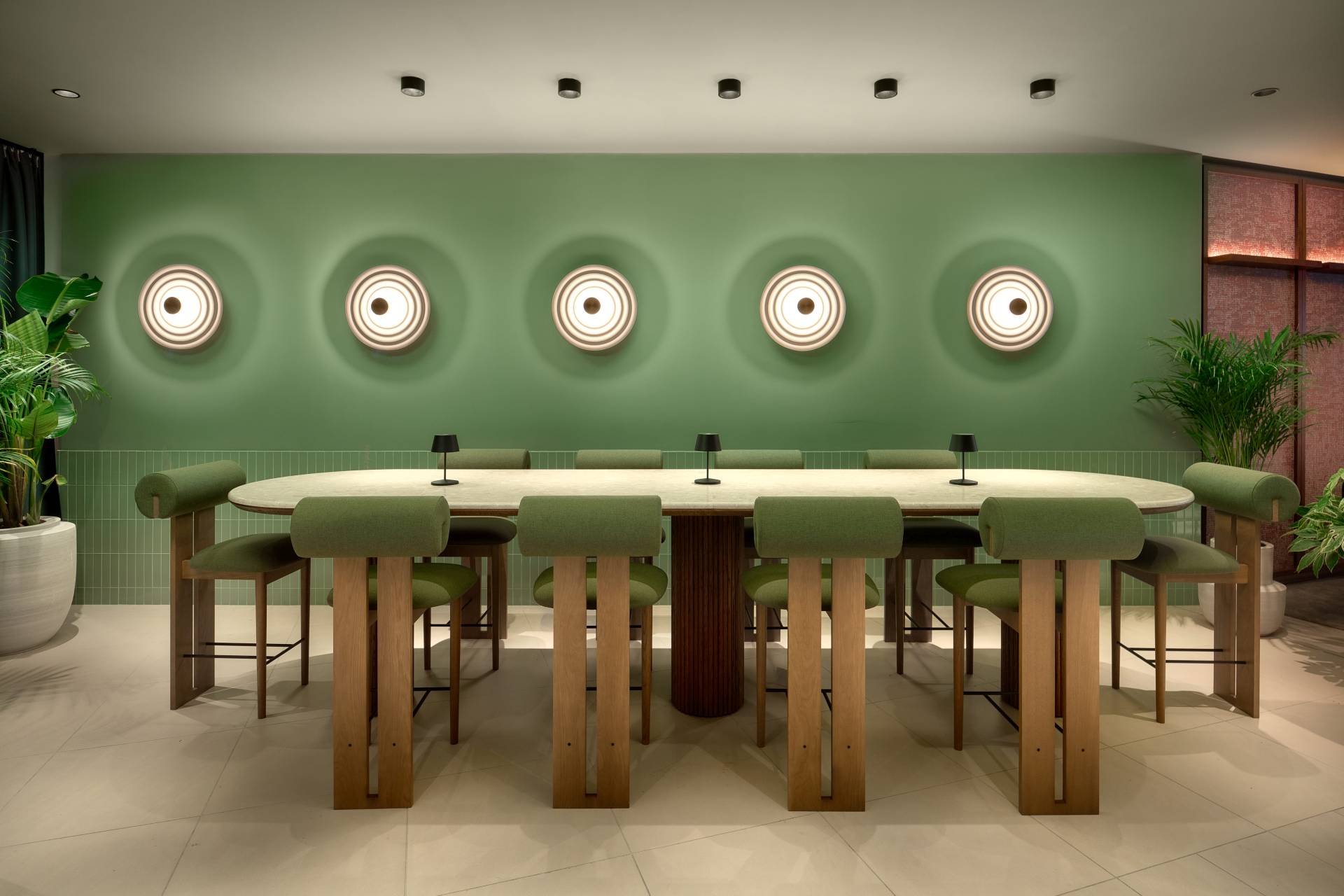 Nameštaj sa detaljima od užadi, zelene sofe, centralno ostrvo za sedenje, kao i pažljivo birani detalji poput podnih lampi, tepiha i makrame pregrada, stvaraju atmosferu nalik vrtnoj oazi.