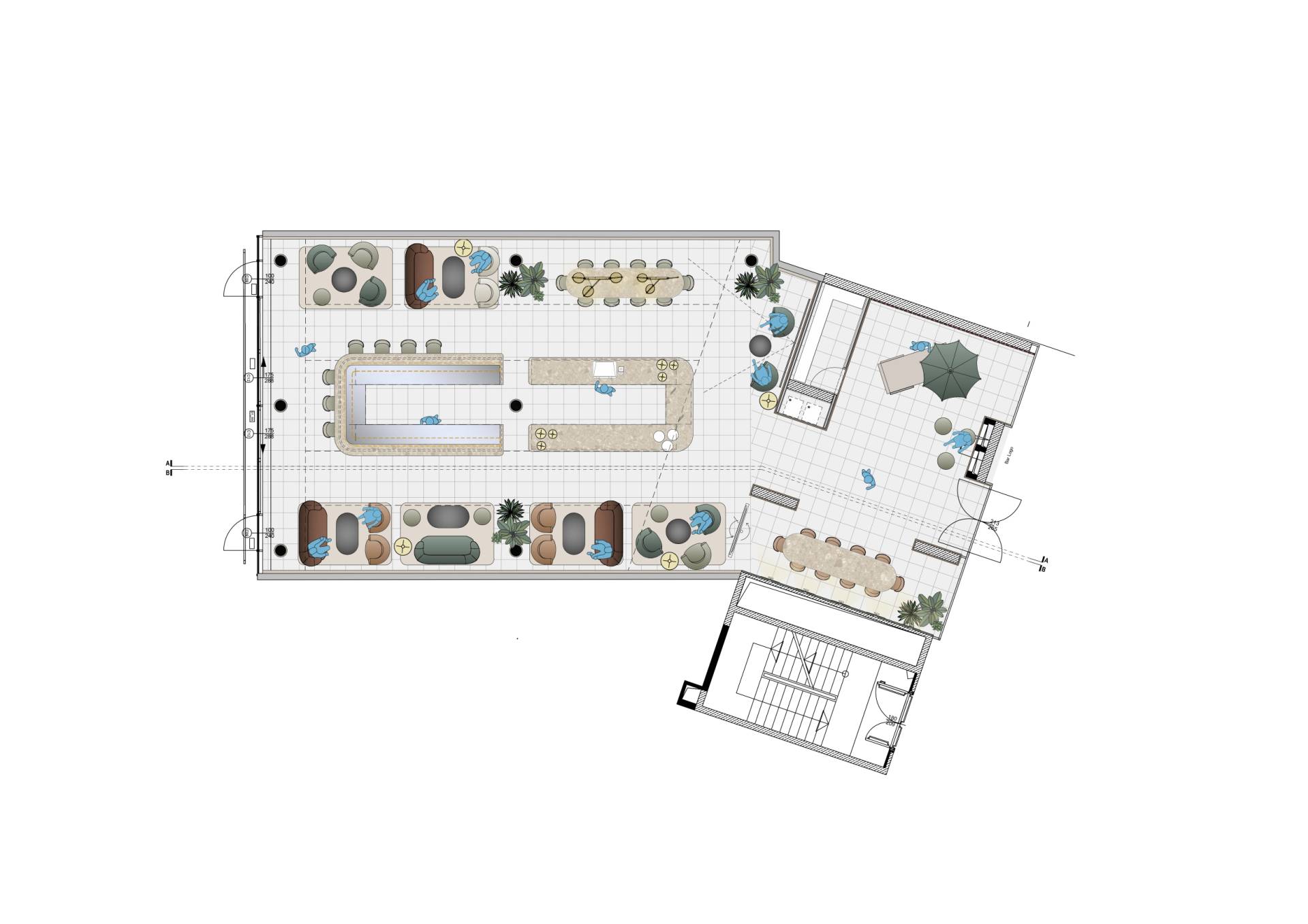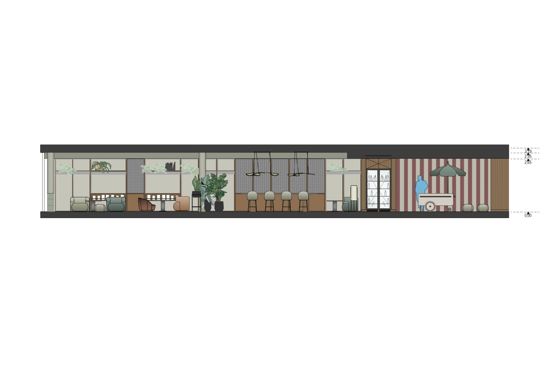 Ovakva dvostruka organizacija prostora omogućava prirodan prelaz iz dnevne u večernju atmosferu, od ispijanja kafe do večernjih koktela.