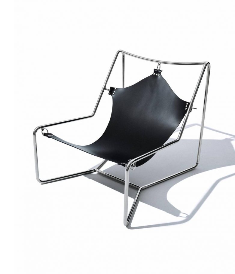 Akcentna fotelja od metala i kože – elegantna, minimalistička, u prepoznatljivom duhu osamdesetih.