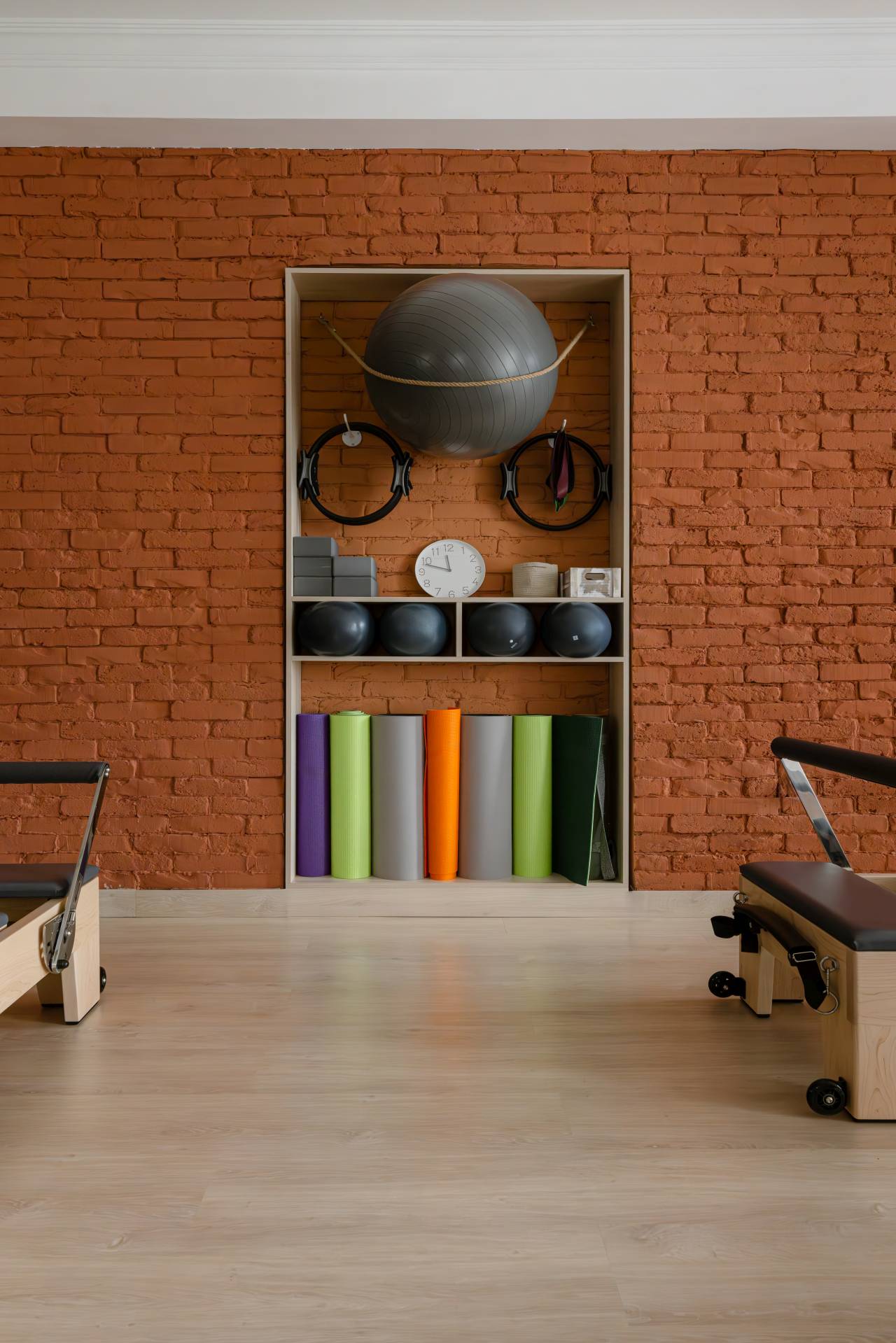 Terakota zid kontrastiran je svetlom drvetu poda i nameštaja, dok sive zavese i detalji stvaraju sklad sa spravama za vežbanje.