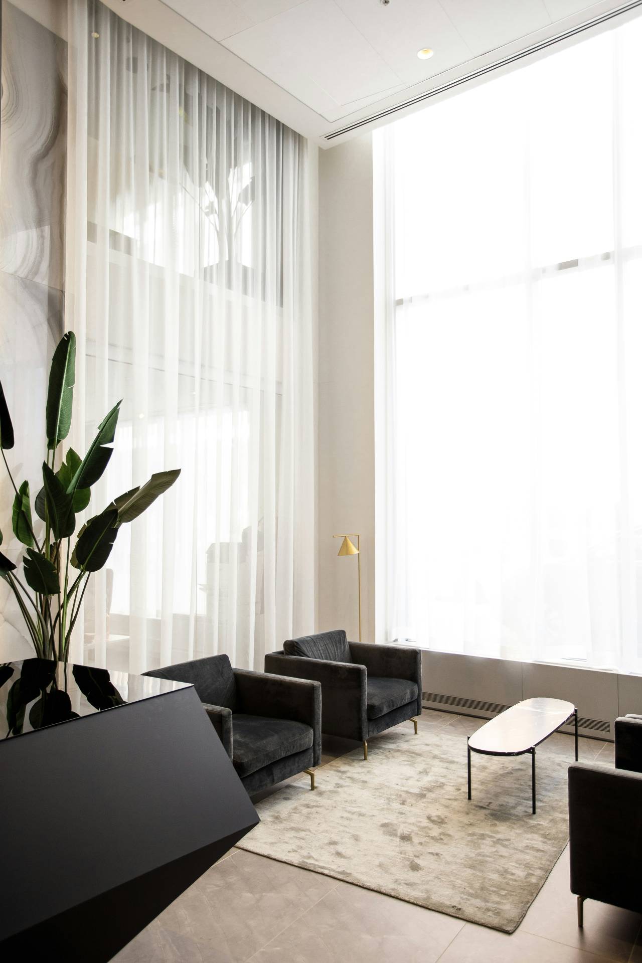 Toplina se unosi kroz tekstil: sivi i bež jastuci, mekana ćebad prebačena preko radne stolice, zavese koje podsećaju na enterijere hotelskih konferencijskih sala.