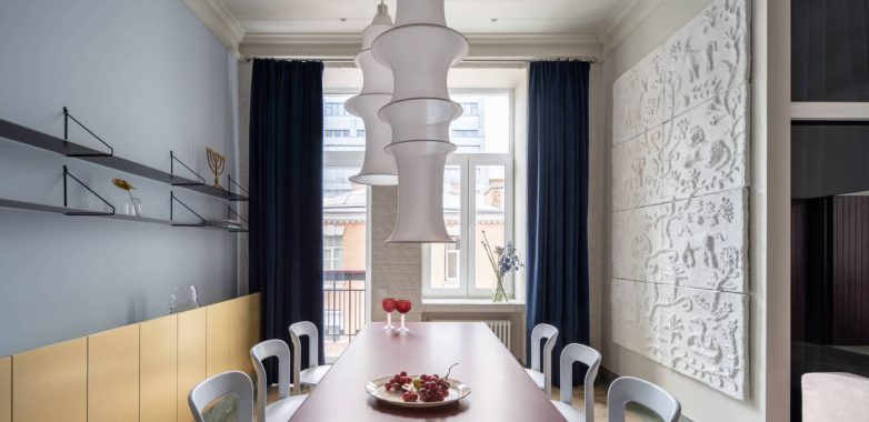 Plava nijansa zida preuzeta je iz zajedničkog prostora, dok je sa suprotne strane sačuvan reljef originalne opeke. Akcentna noga stola sa izraženim dezenom čini ga vidljivim već iz hodnika, dok umetnički radovi zaokružuju celinu.