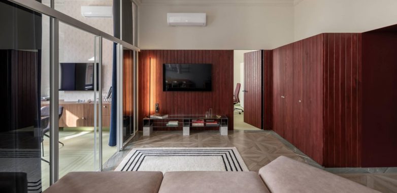 Prostor smešten iza staklene pregrade karakterišu snažni kontrasti uglastih i zaobljenih formi. Crna i crvena boja definišu ozbiljniju radnu atmosferu, dok svetliji tonovi i dekorativni motivi na plafonu vizuelno rasterećuju prostor.