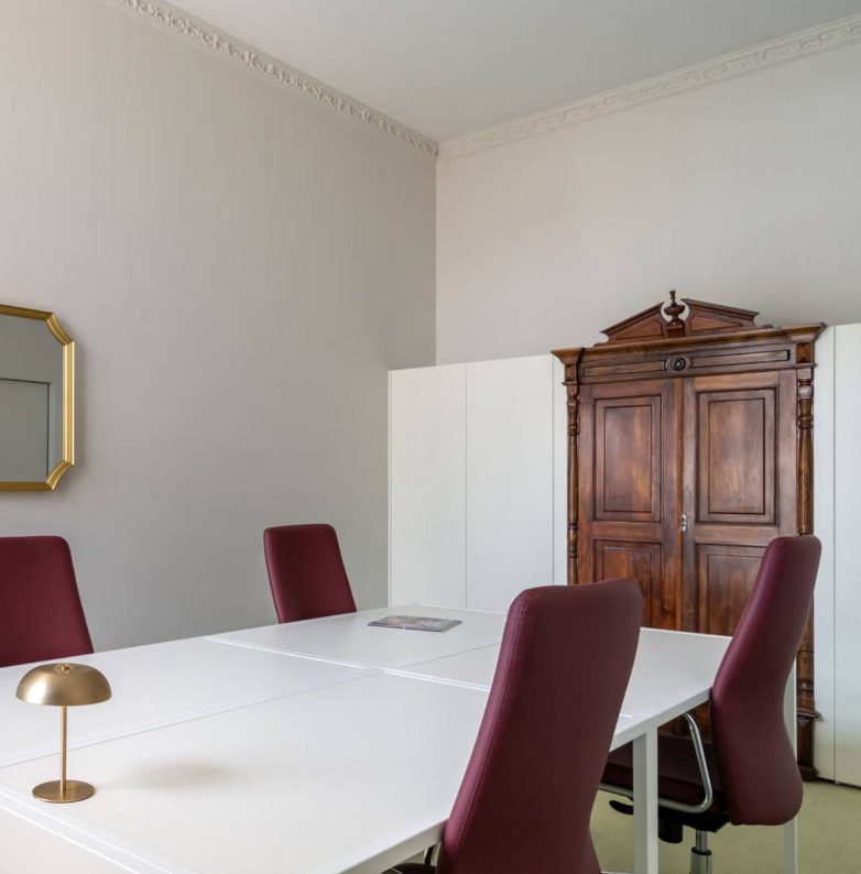 Kancelarija je organizovana u četiri funkcionalne radne zone, od kojih svaka ima sopstvenu atmosferu. Prostor najbliži susednoj sinagogi, koja je istorijski oblikovala ovaj deo grada, suptilno reflektuje okruženje kroz toplu žutu nijansu u paleti i zavesu u boji senfa, kao diskretnu referencu na boju fasade.