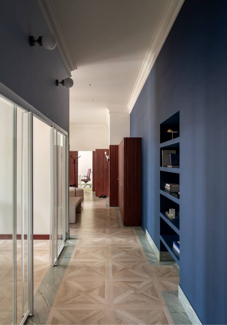 Direktorska kancelarija nalazi se u izdvojenom delu prostora, sa dodatnim izlazom. Na minimalističku osnovu dodati su izraženi akcenti, poput tamnoplavih zidnih polica i redizajnirane fotelje nastale “upcycling” procesom.