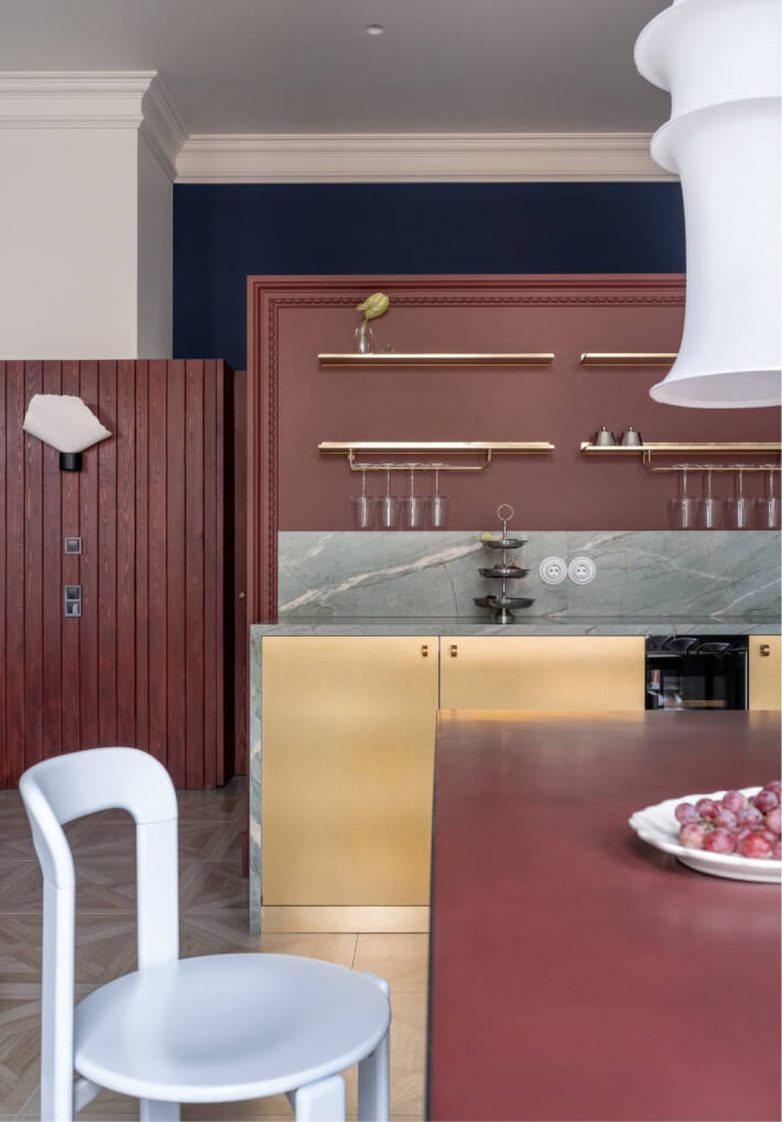 Bogati kontrasti boja, bordo tonovi na drvenim panelima i kuhinjskoj pregradi u kombinaciji sa eukaliptus zelenom i jarko plavom, uz raznovrsne teksture, formiraju dinamičan, ali uravnotežen prostor u kojem se komfor i elegancija prirodno prepliću.