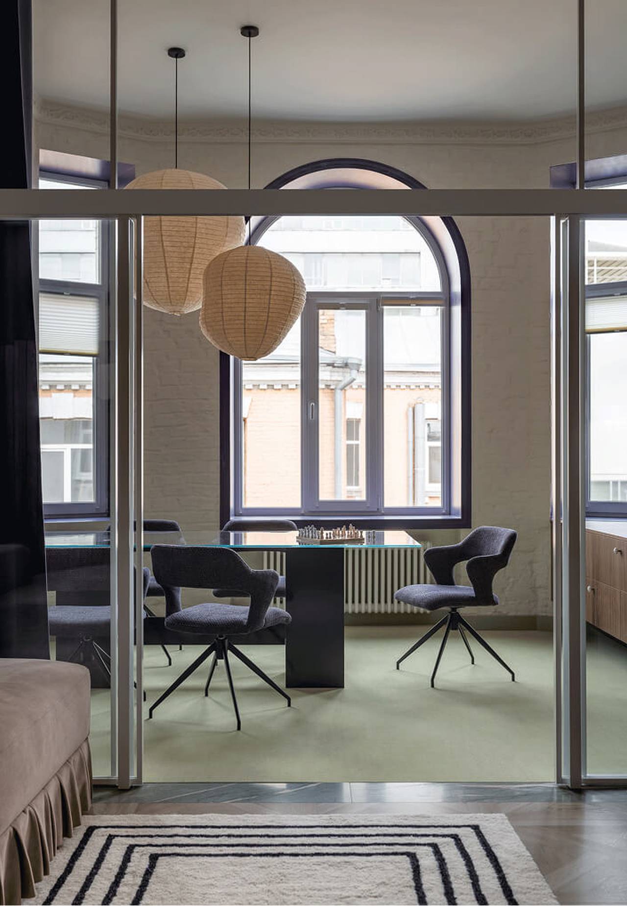 U enterijeru se smenjuju hladni i topli tonovi, dok japanske papirne lampe unose meko i difuzno svetlo.