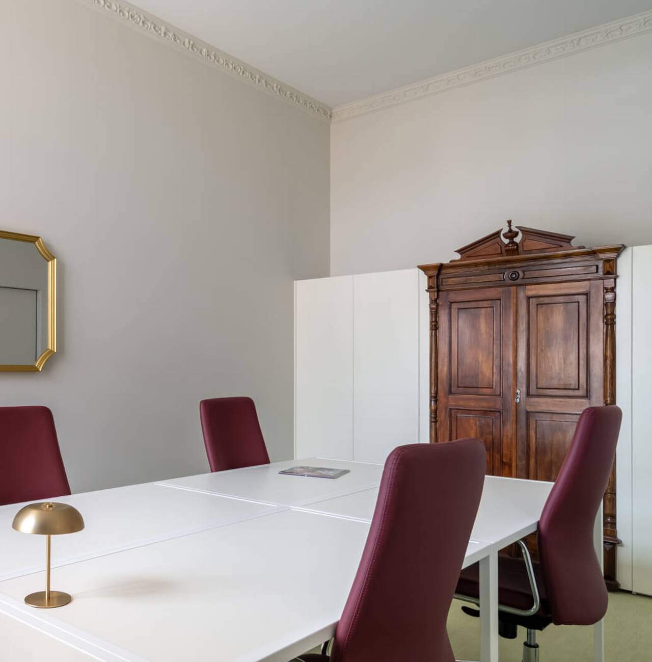 Klasične proporcije prostorije, dekorativni rad na spoju zidova i plafona, kao i pažljivo birani vintidž detalji, stvaraju ambijent koji je snažno povezan sa istorijom mesta, ali interpretiran kroz savremeni dizajnerski izraz.