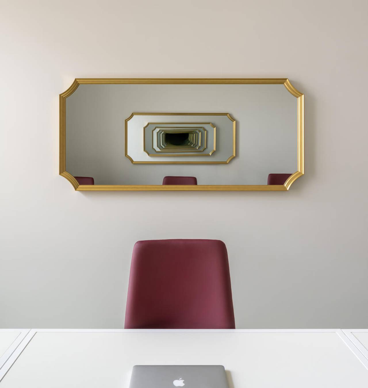Prostor smešten iza staklene pregrade karakterišu snažni kontrasti uglastih i zaobljenih formi. Crna i crvena boja definišu ozbiljniju radnu atmosferu, dok svetliji tonovi i dekorativni motivi na plafonu vizuelno rasterećuju prostor.