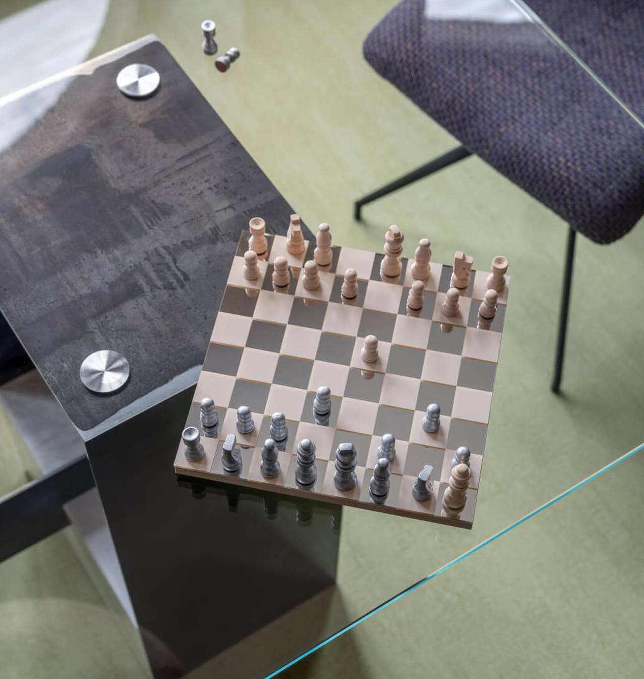 Direktorska kancelarija nalazi se u izdvojenom delu prostora, sa dodatnim izlazom. Na minimalističku osnovu dodati su izraženi akcenti, poput tamnoplavih zidnih polica i redizajnirane fotelje nastale “upcycling” procesom.
