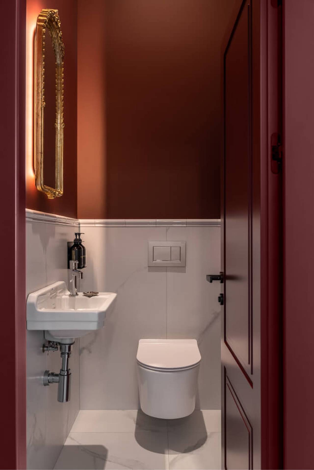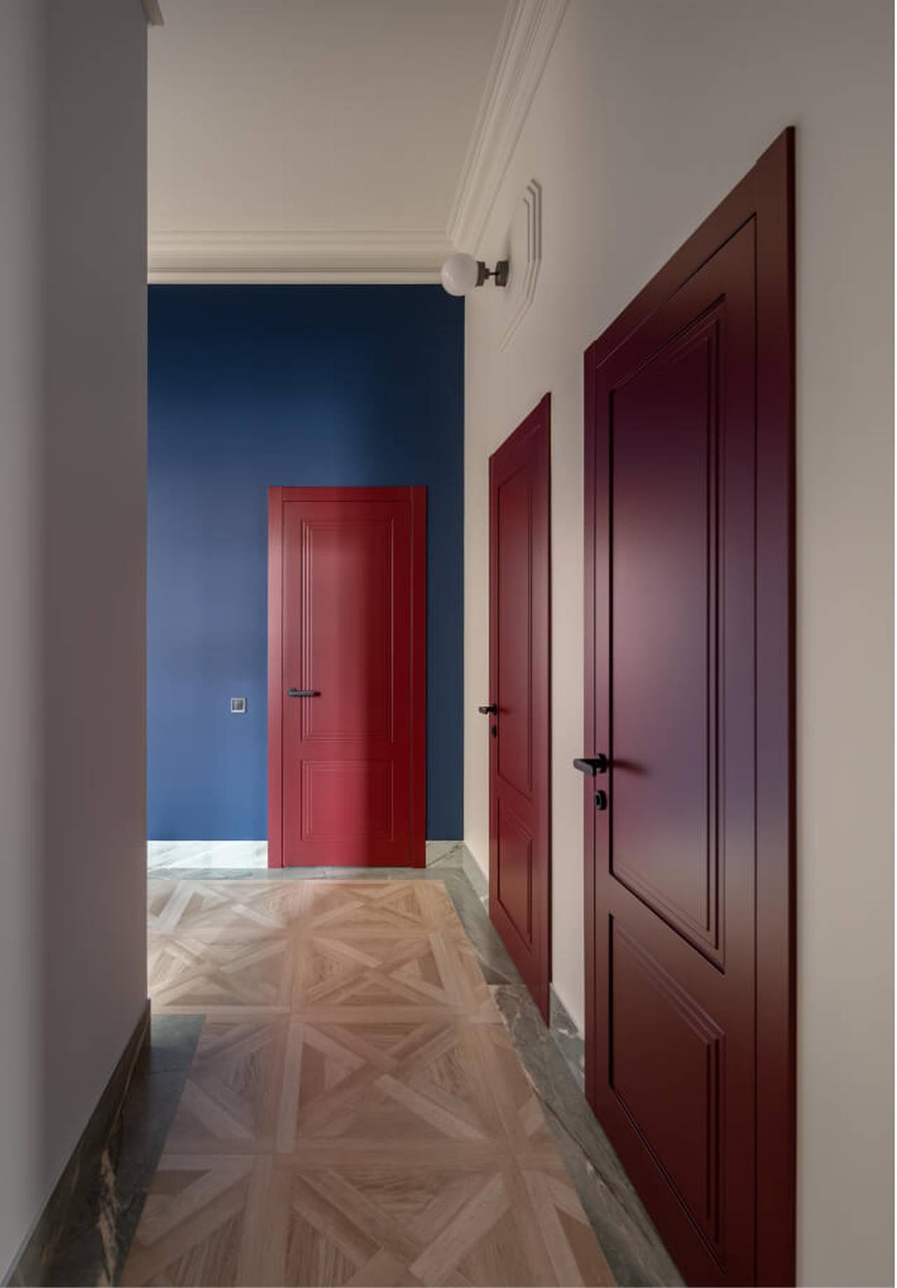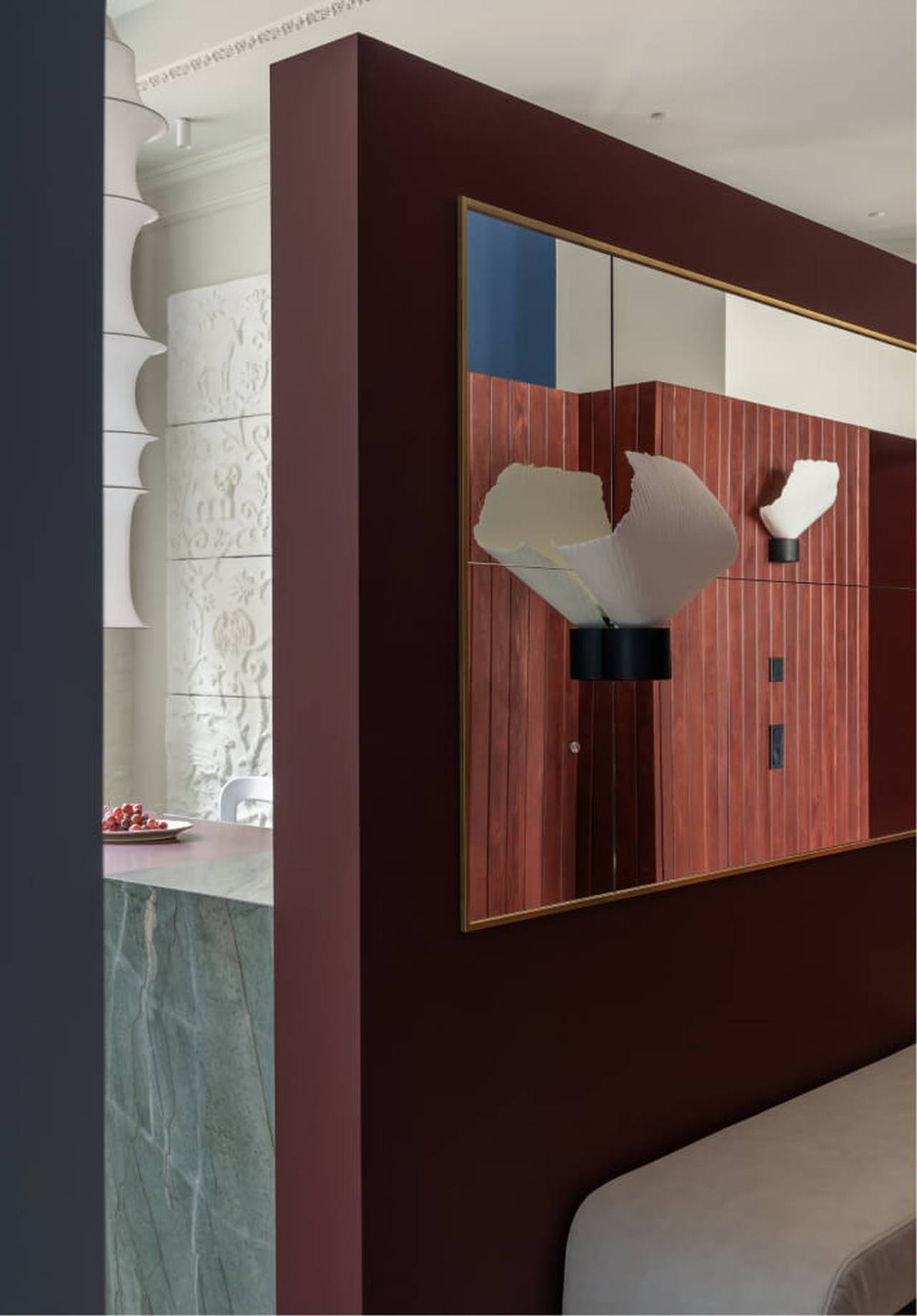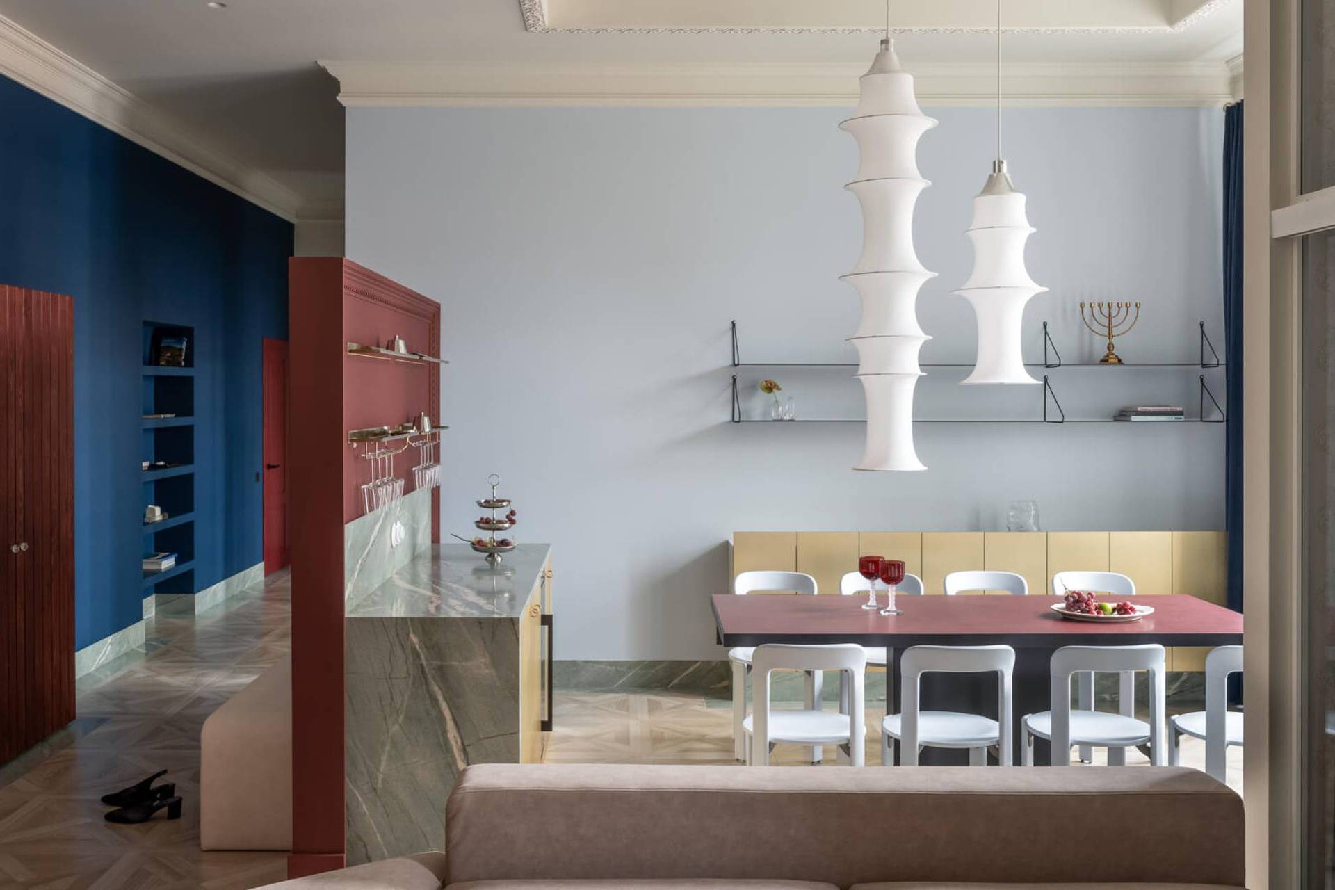 Bogati kontrasti boja, bordo tonovi na drvenim panelima i kuhinjskoj pregradi u kombinaciji sa eukaliptus zelenom i jarko plavom, uz raznovrsne teksture, formiraju dinamičan, ali uravnotežen prostor u kojem se komfor i elegancija prirodno prepliću.