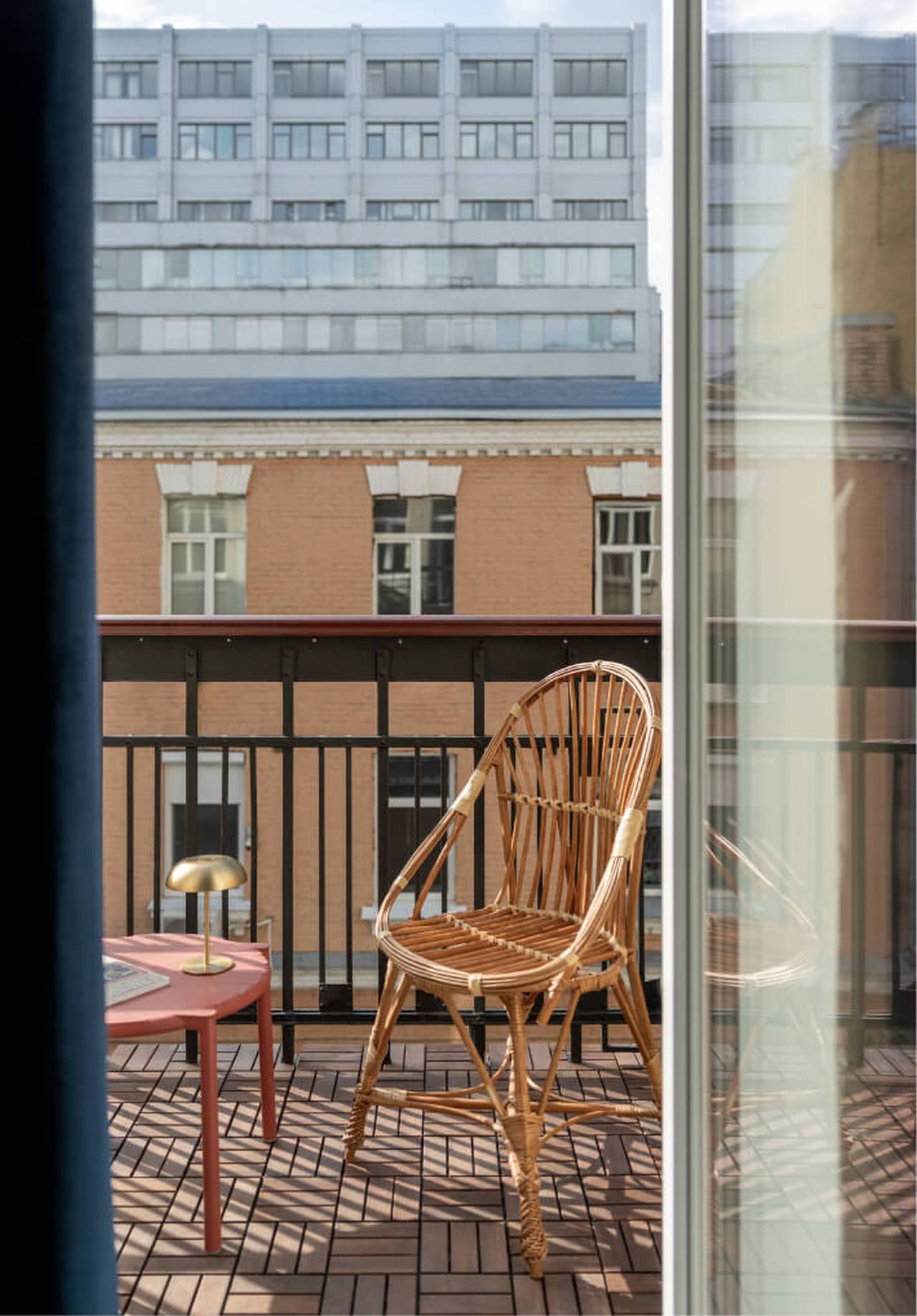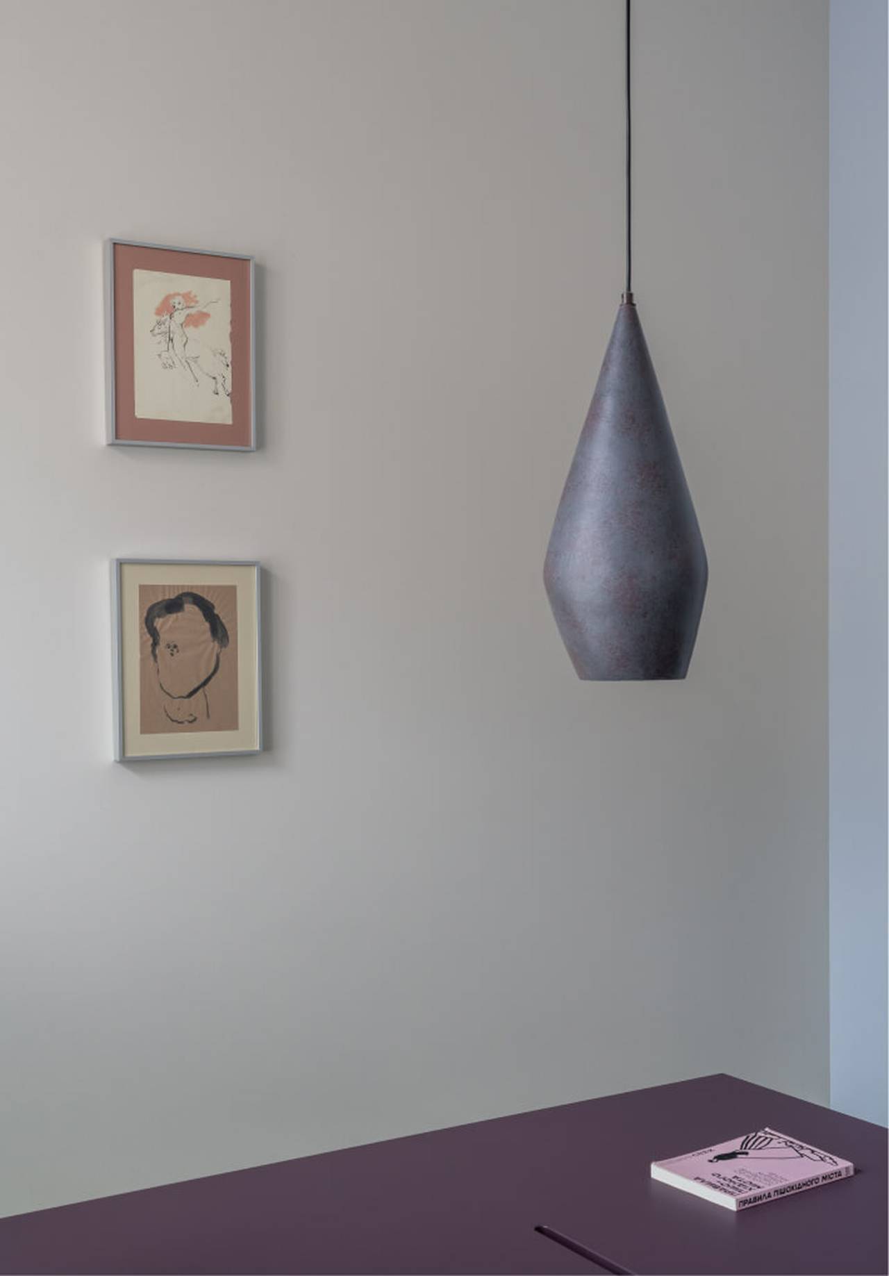 Plava nijansa zida preuzeta je iz zajedničkog prostora, dok je sa suprotne strane sačuvan reljef originalne opeke. Akcentna noga stola sa izraženim dezenom čini ga vidljivim već iz hodnika, dok umetnički radovi zaokružuju celinu.
