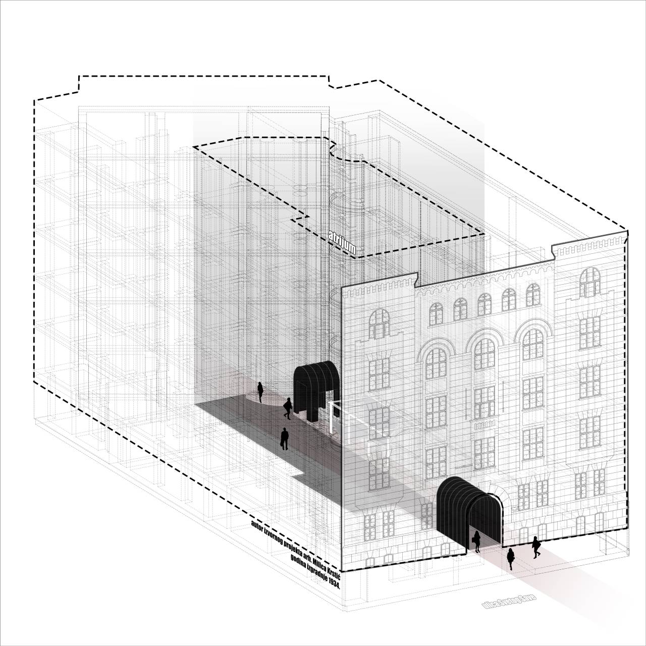 Inspiracija atrijumom kao delom “neba” dovela je do formiranja transparentne opne – staklene strukture koja nadograđuje suterenski prostor bez opterećenja i agresivnosti.