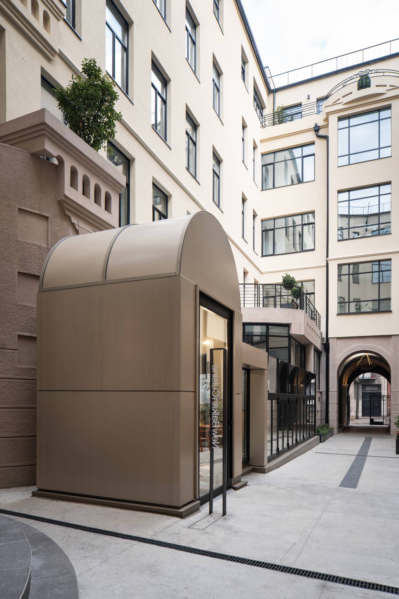 Staklena nadogradnja u atrijumu formira novi mikroambijent, dok valjkasti prostorni akcenat diskretno povezuje zatečene strukture sa savremenim slojem.