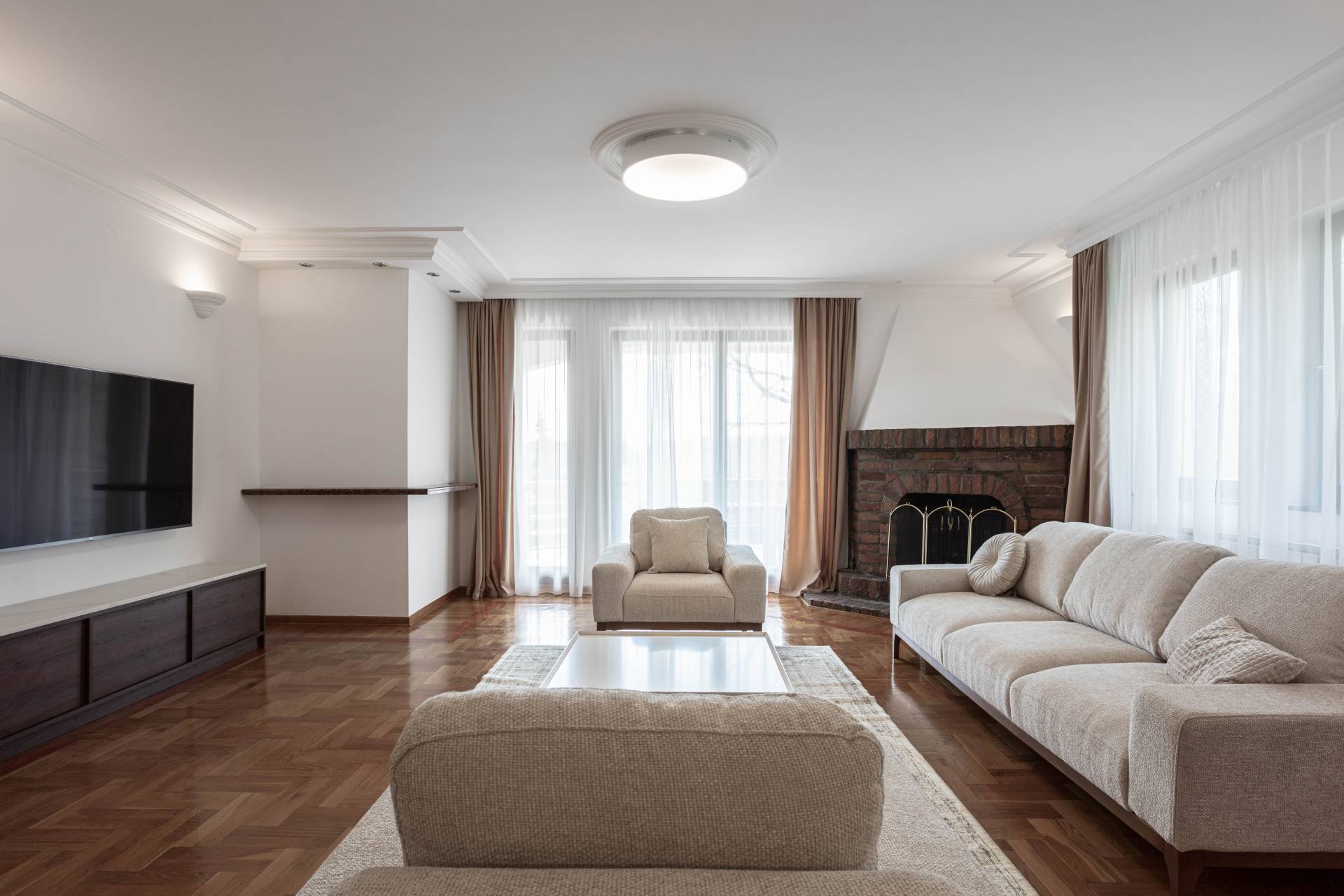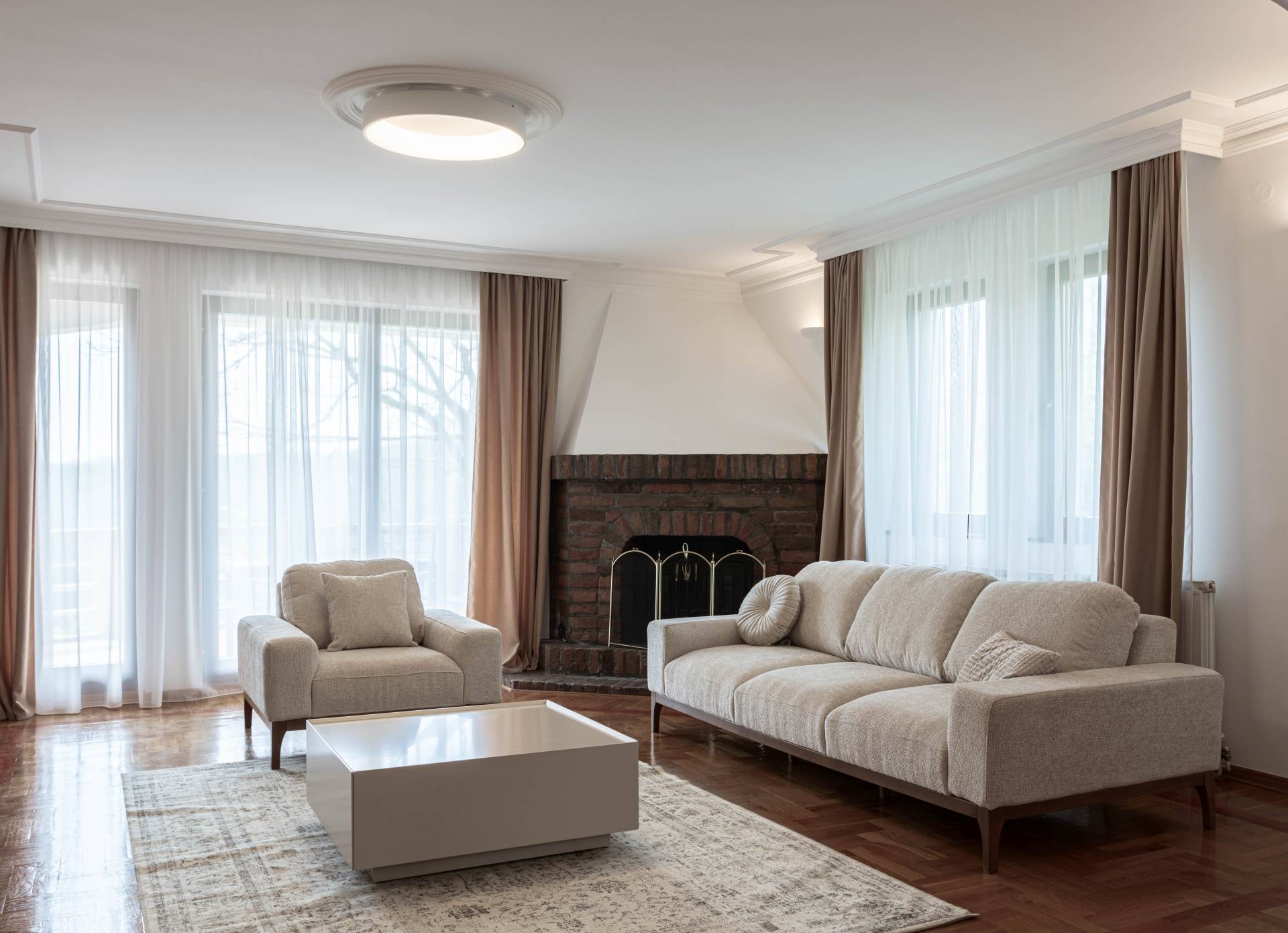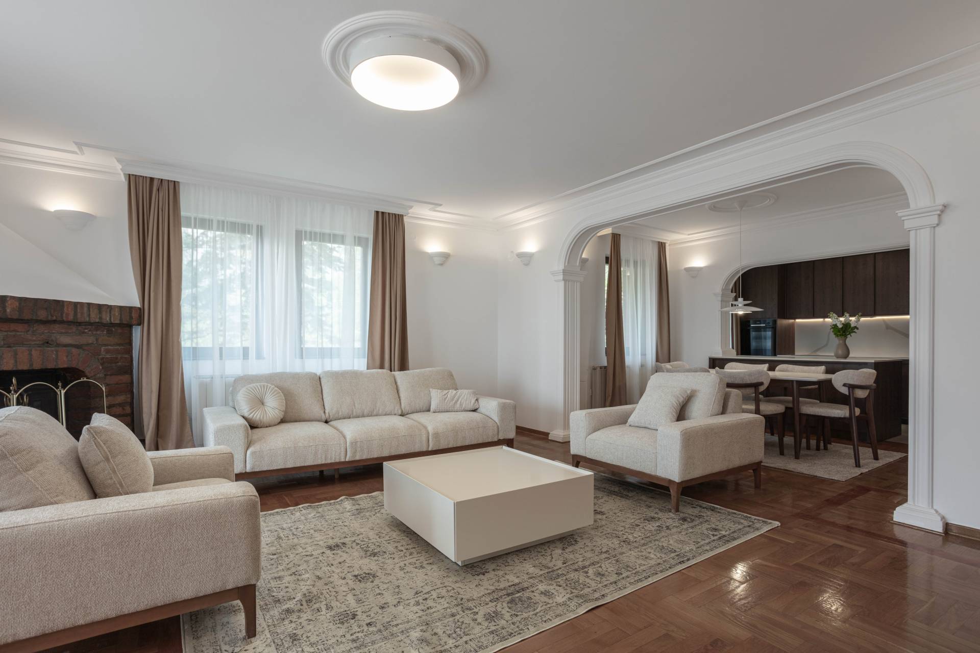 Glavni koncept projekta zasnivao se na očuvanju elemenata koji su definisali originalni enterijer – gipsanih plafonskih profila, zidnih gipsanih lampi, parketa sa ornamentima i kamina kao centralne tačke dnevnog boravka.