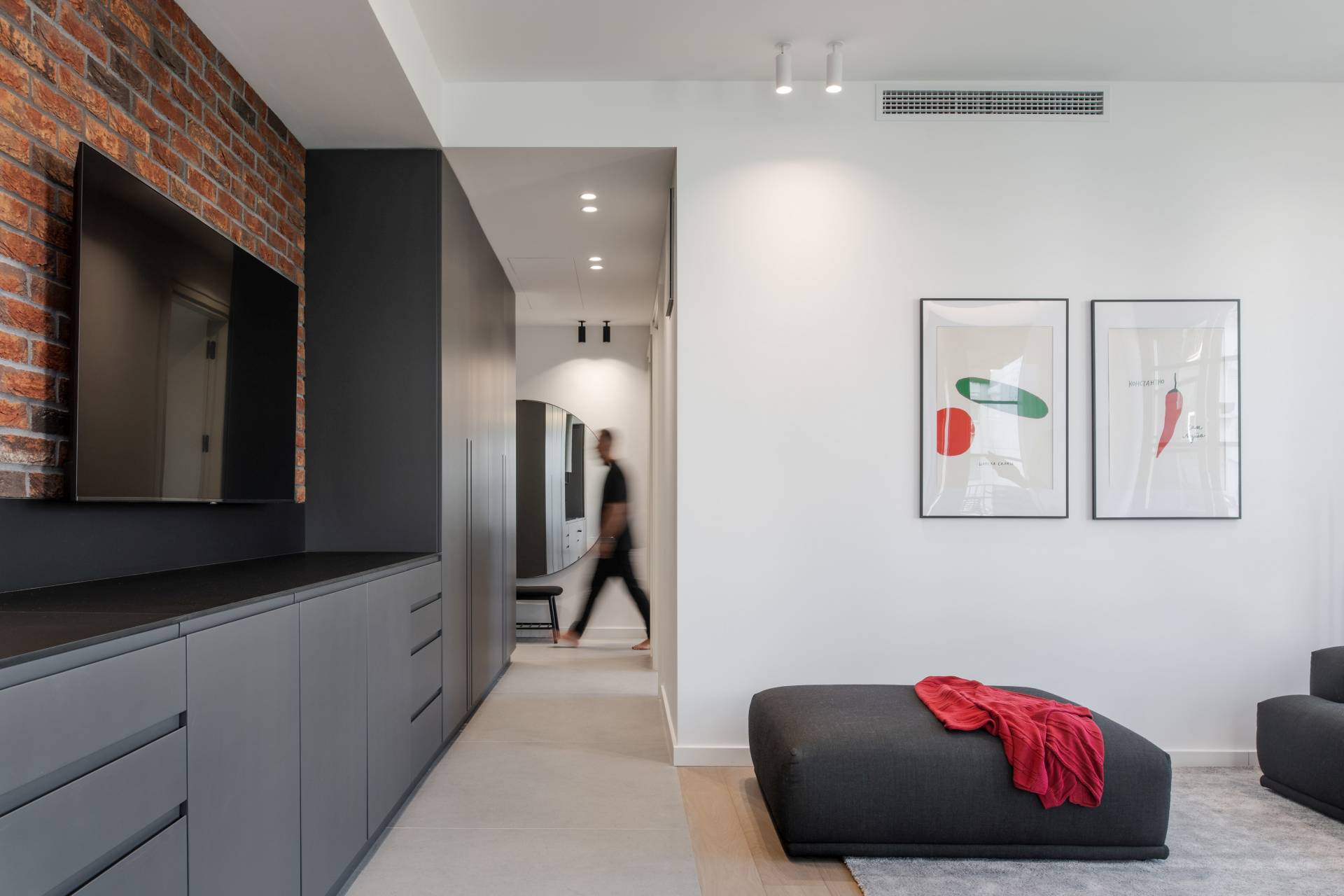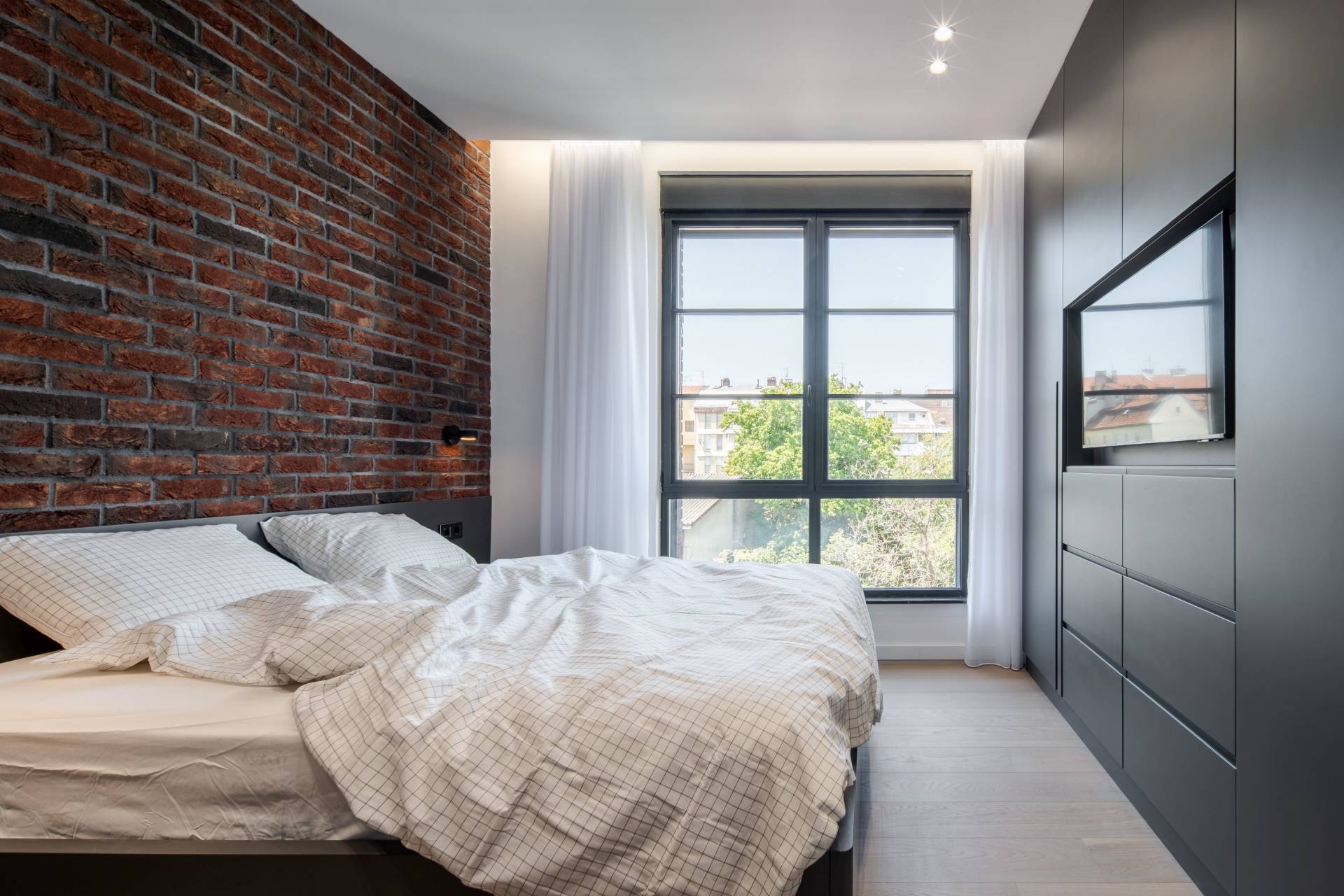 Identitet stana oblikovan je upotrebom industrijskih materijala, sa naglaskom na zidovima od opeke. Oni unose sirovost i robustnost, dok ih naspramno balansiraju glatke površine nameštaja, stakleni detalji i neutralna paleta boja.