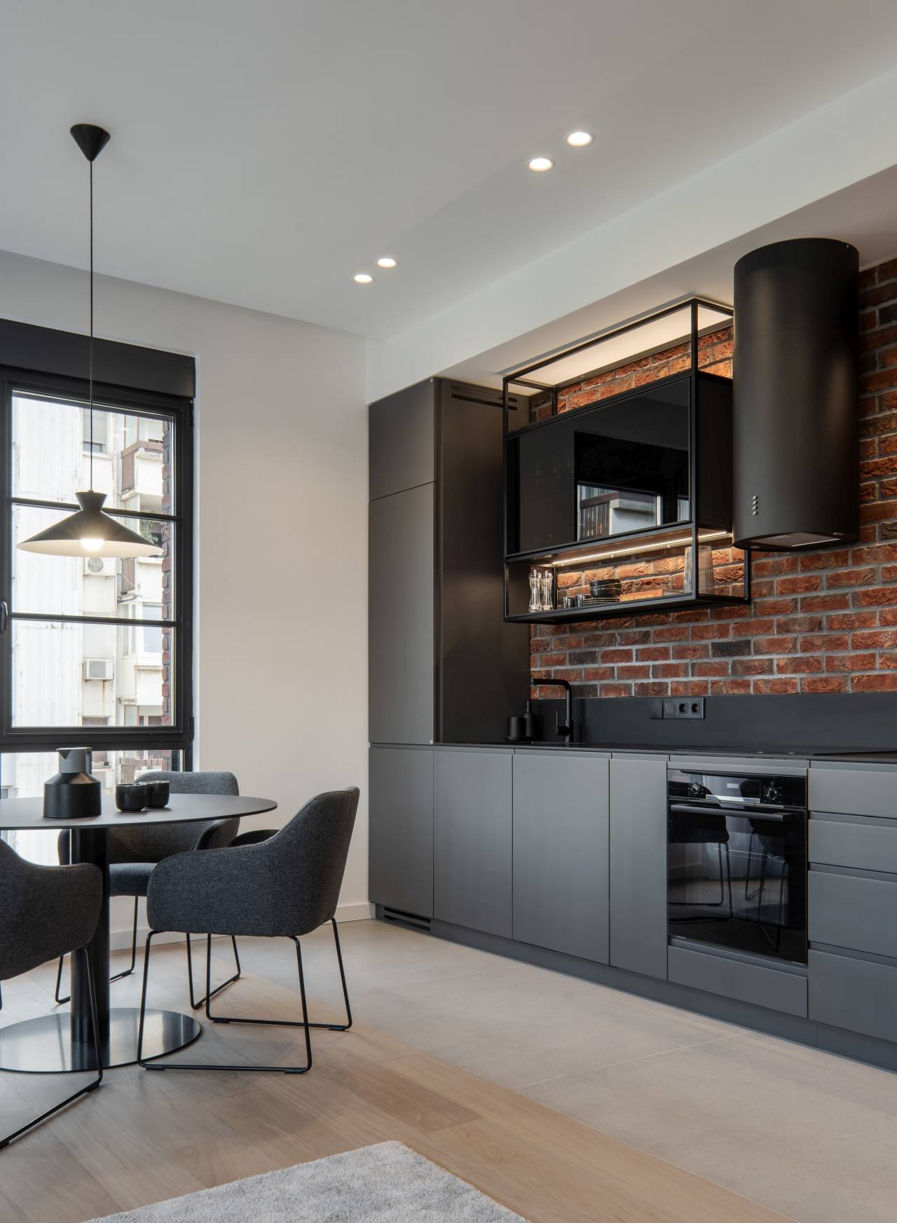 Naglašen industrijski identitet balansiraju glatke površine nameštaja, stakleni detalji i neutralna paleta boja.