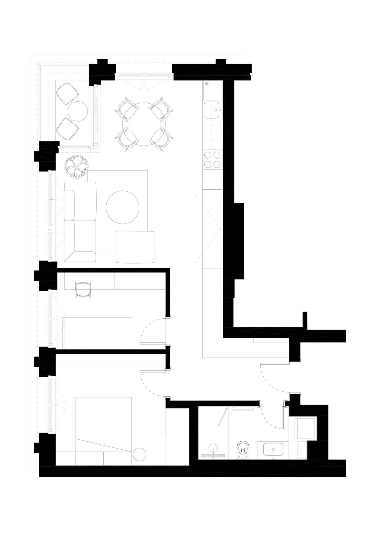 Stan je podeljen na dnevnu i noćnu zonu, pri čemu je dnevni deo koncipiran kao fluidan prostor koji objedinjuje kuhinju, trpezariju i dnevni boravak.