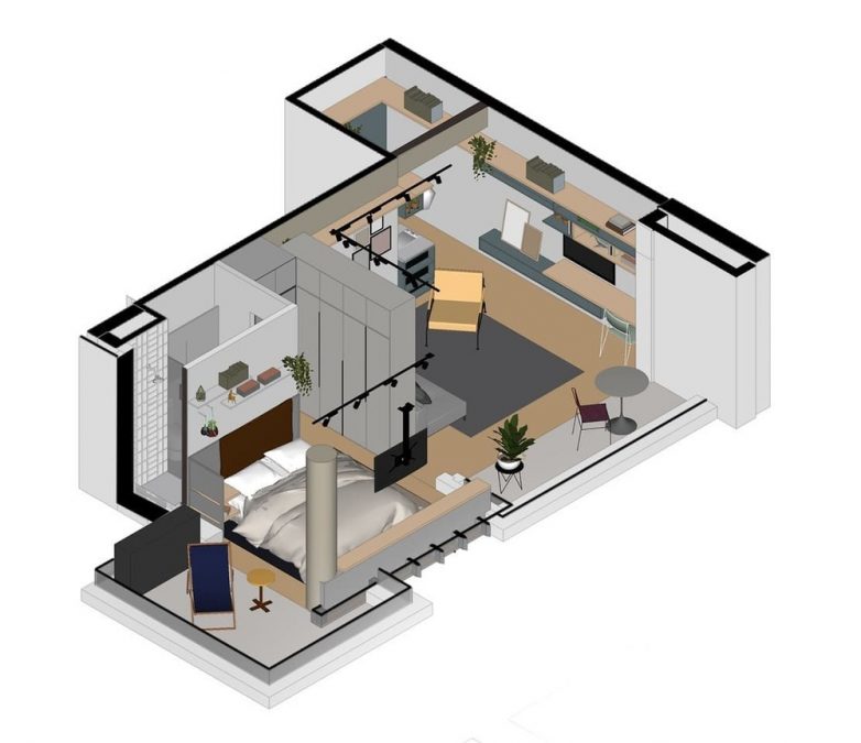 Arhitektonski studio je sa projektom započeo dok je stan još uvek bio u nedovršenoj fazi. Imajući u vidu njegovu ograničenost prostorom i vrlo specifičnu spoljašnju arhitekturu stana, studio je uradio istraživanje o dnevnim potrebama jednog čoveka i na osnovu toga je urađen apartman.