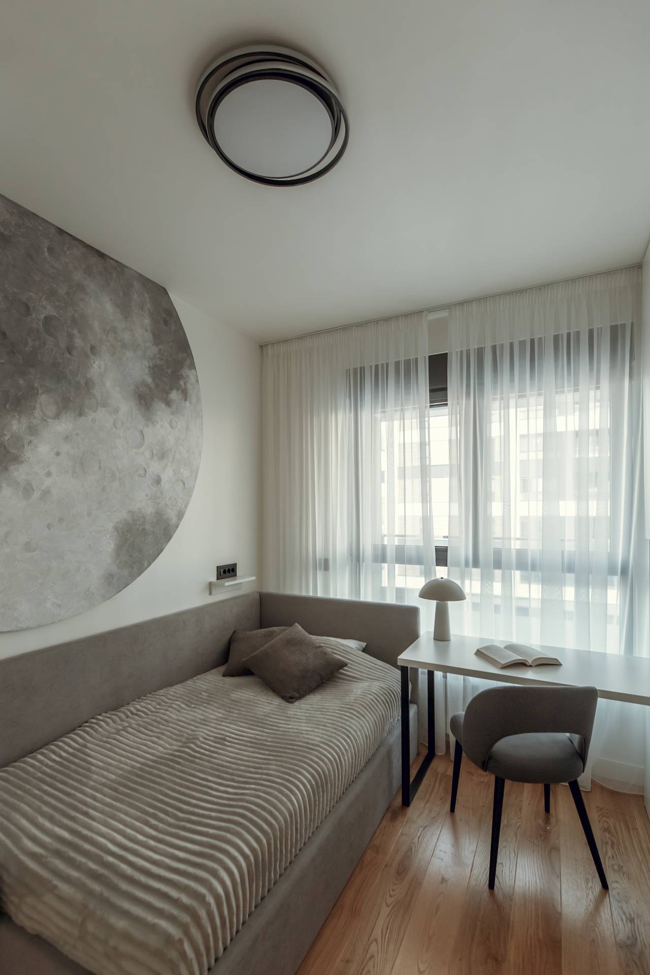 Poseban detalj predstavlja zidni panel sa osvetljenjem u obliku meseca, koji spavaću sobu pretvara u intimnu i gotovo poetsku scenu.
