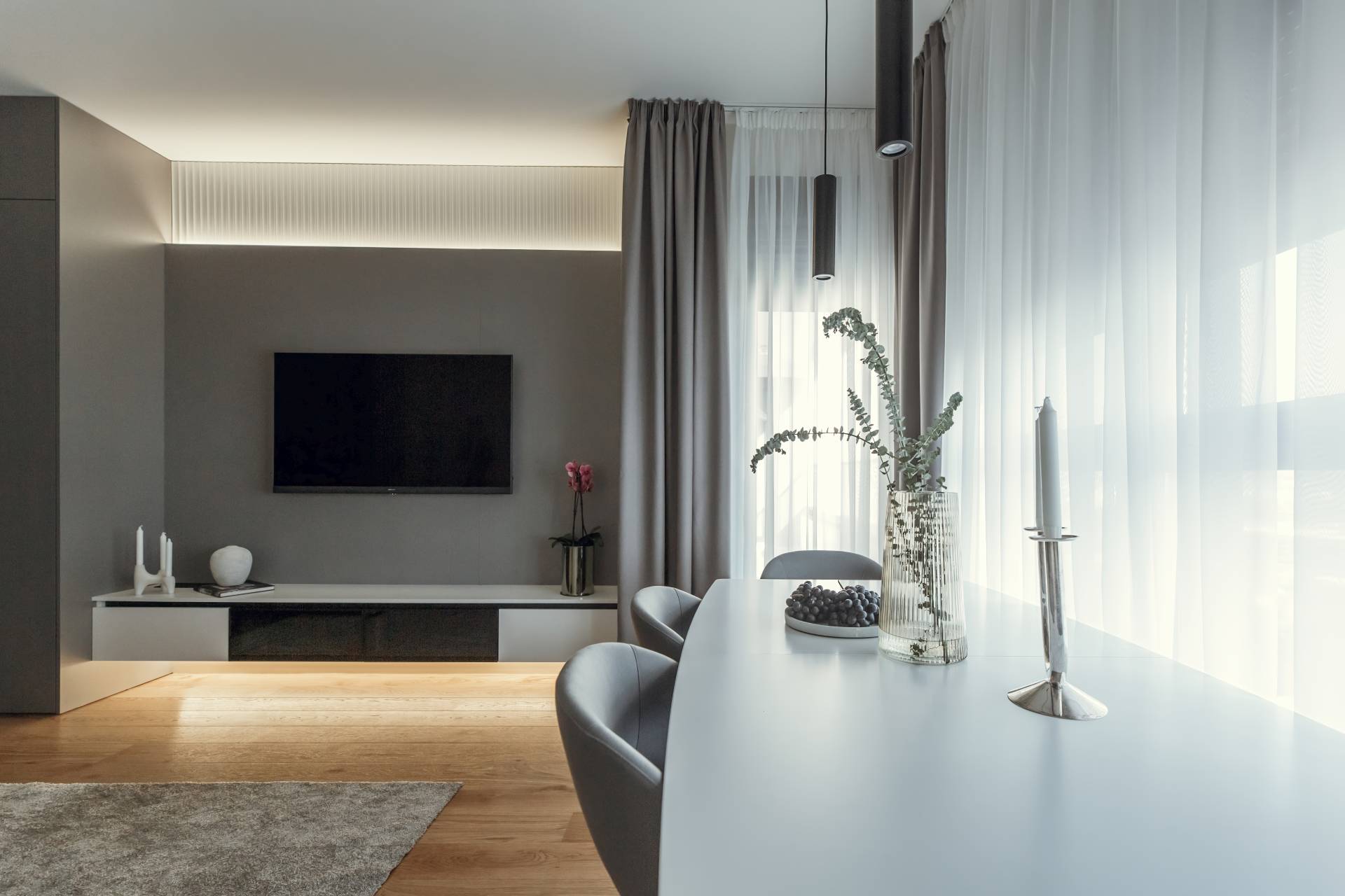 Postojeći pod od prirodnog hrasta poslužio je kao idealna osnova za dalji razvoj enterijera. Svetle zidove upotpunili su sivo-grafitni akcenti na nameštaju i dekoraciji, dok su talasaste MDF obloge unele dinamiku u prostor i razbile ravne površine.