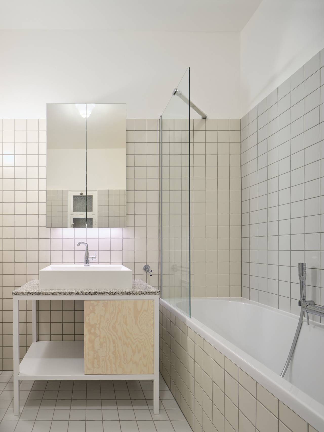 Stakleni blokovi u kupatilu i keramičke pločice dodatno naglašavaju jasnoću i jednostavnost materijalne palete.