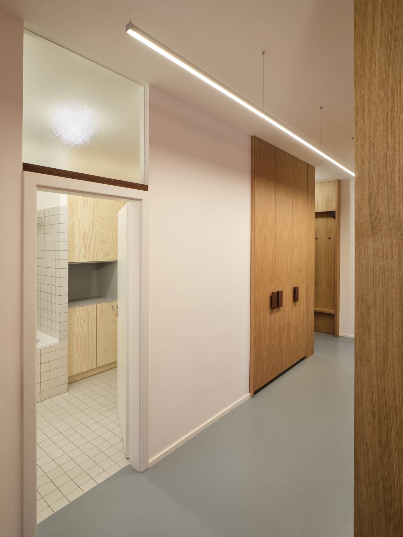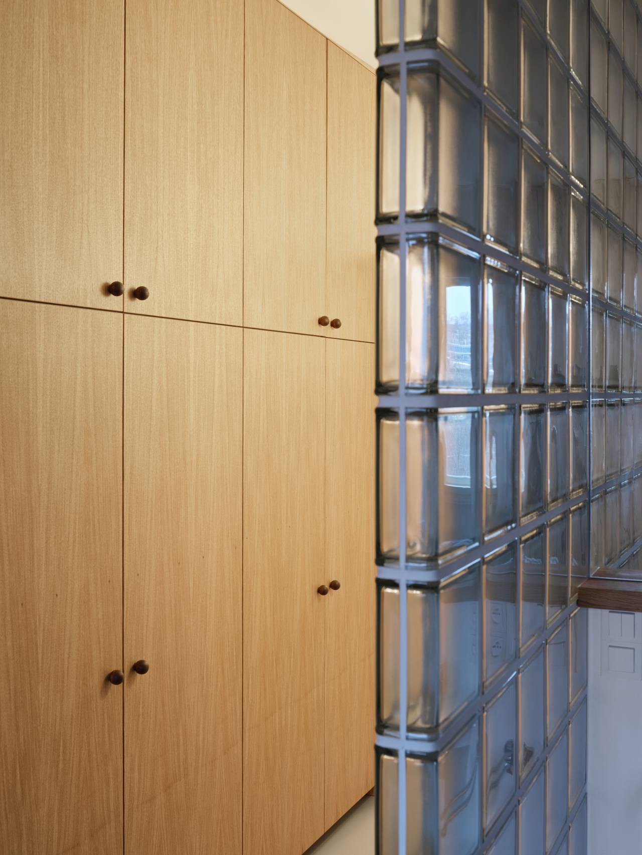 Glavne komunikacije u stanu naglašene su nizom ugradnih ormara od hrastovog furnira, koji prate liniju prelaza između novih i postojećih podova.