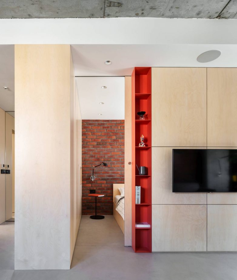 Poseban fokus bio je na razdvajanju dnevne i noćne zone, ali bez klasičnih pregrada. Rešenje je pronađeno u kliznim vratima integrisanim u TV policu, čime je omogućeno da se prostor po potrebi otvara ili zatvara.