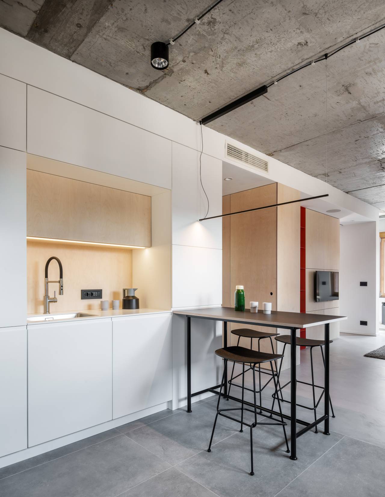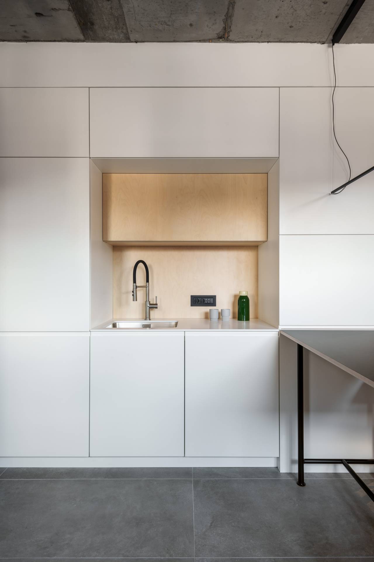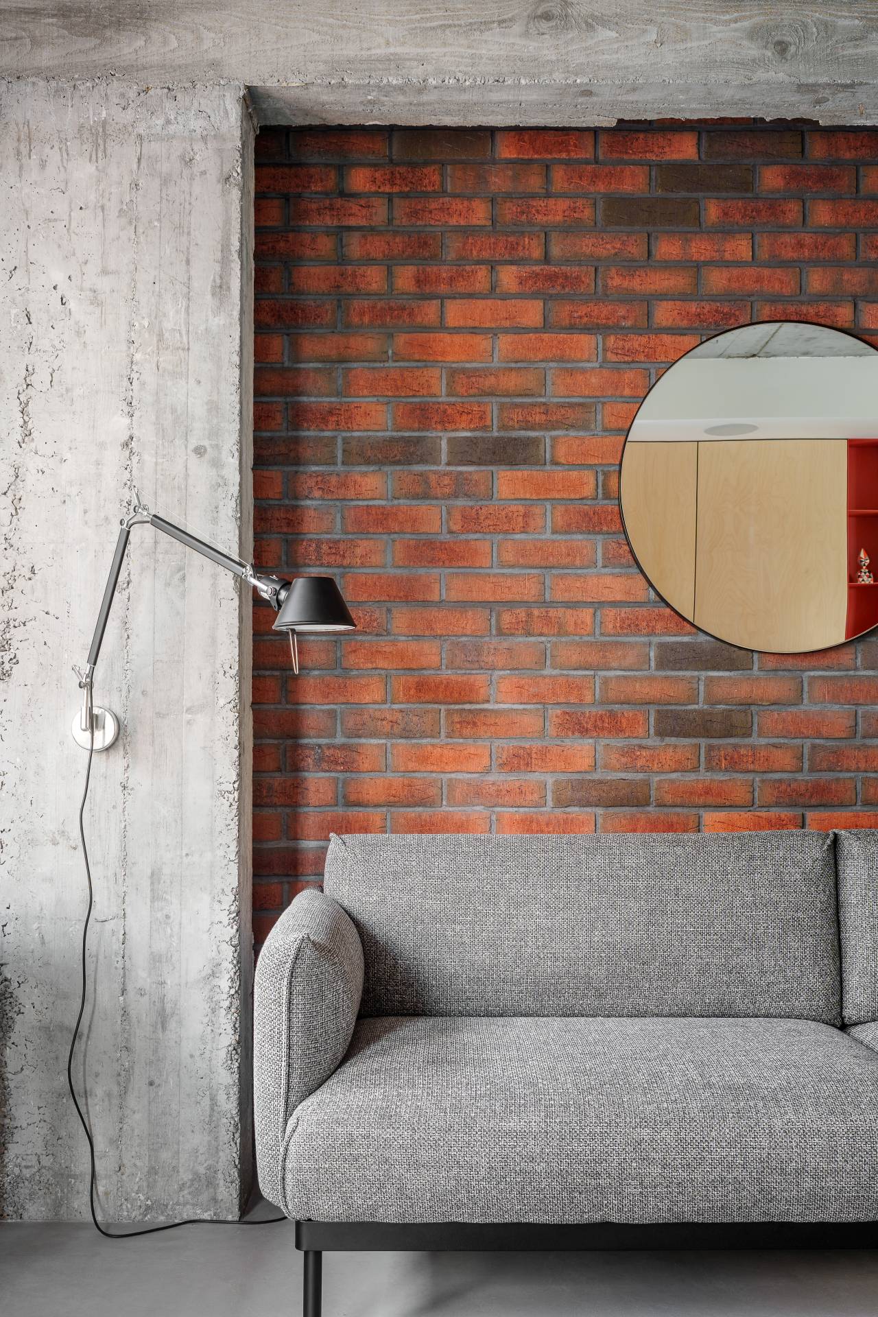 Betonska konstrukcija, koja je u startu dominirala prostorom, postala je nosilac identiteta enterijera. “Početno stanje postalo je ključni arhitektonski element koji definiše identitet enterijera”, navode iz studija, uz dodatak da je inspiracija pronađena u spoju industrijskih materijala i toplijih, prirodnih tekstura.