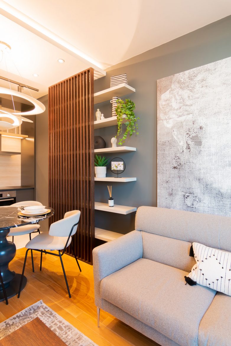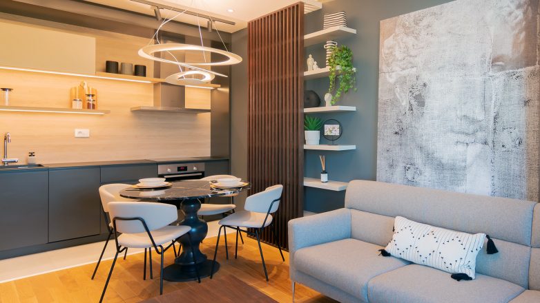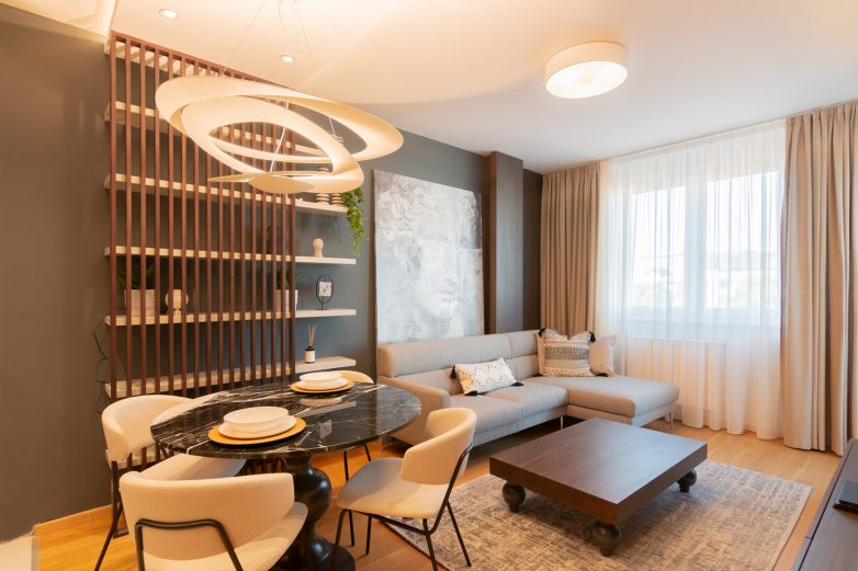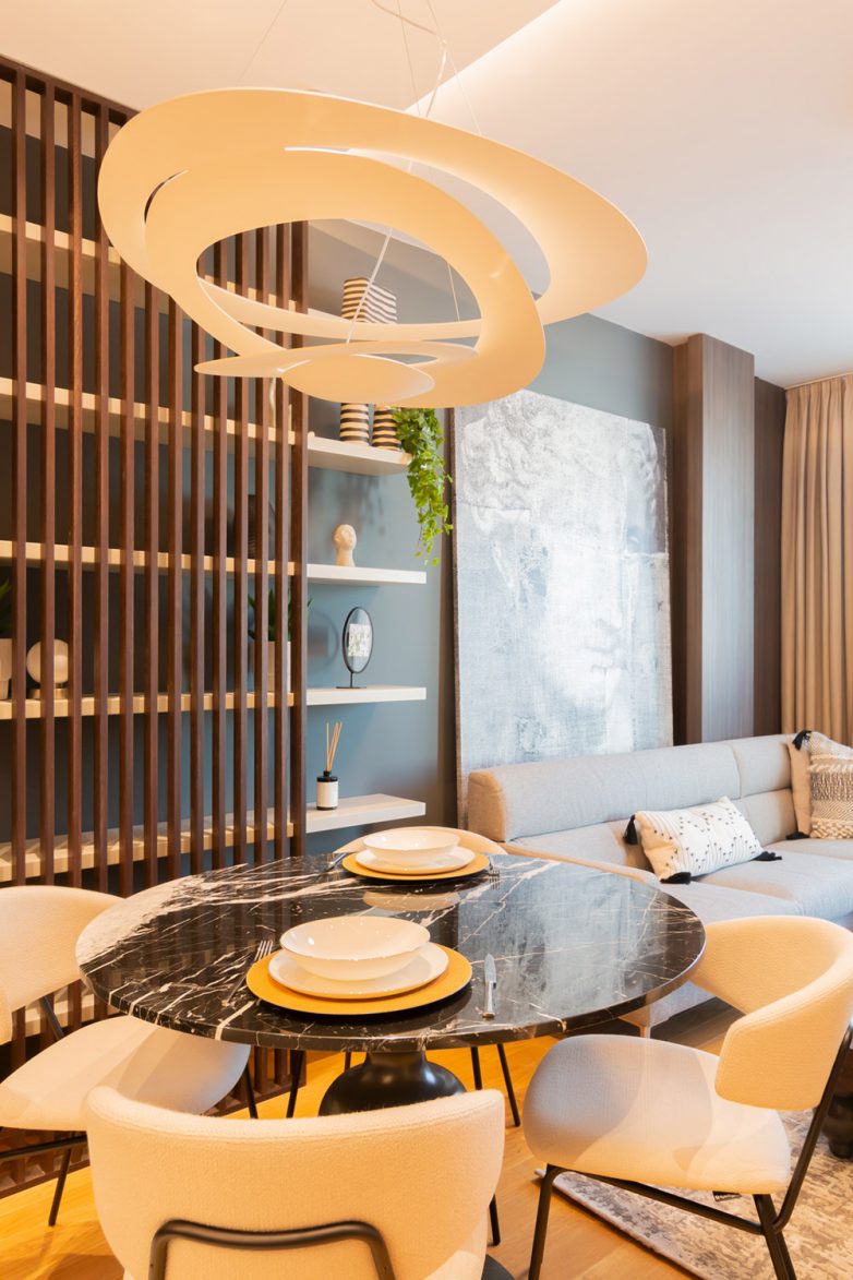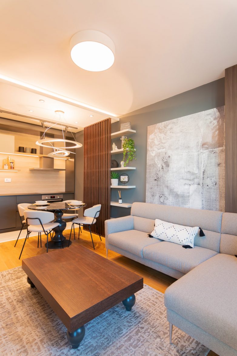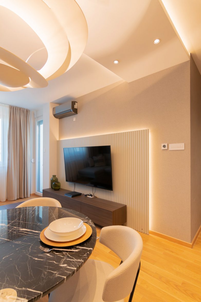Kako bi se ipak vizuelno razdvojile celine obedovanja i dnevne sobe u jednom prostoru, iznad trpezarijskog stola postavljen je spušten plafon što je omogućilo postavku ugradne rasvete i indirektnog svetla u vidu LED traka. Ovaj prostor dodatno je istaknut sa policom s lestvicama ispred koje je okačen veliki Artemidin luster.