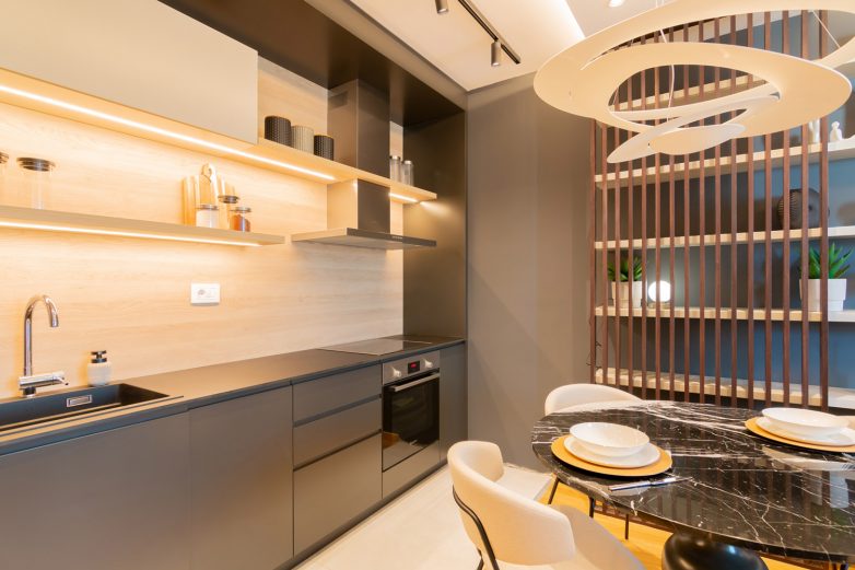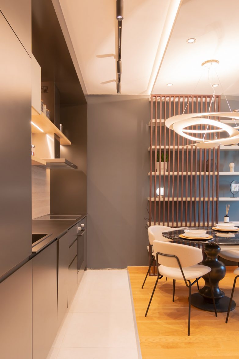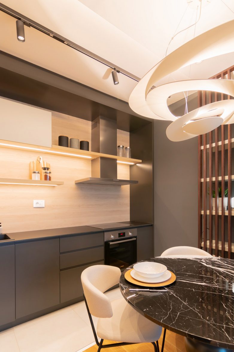 Kuhinja je izvedena u dve nijanse sive boje dok su radna ploča i zidna obloga u istoj teksturi drveta. Kao dominantan elemenat izdvaja se zidni aspirator i otvorene police sa ugrađenim LED trakama.