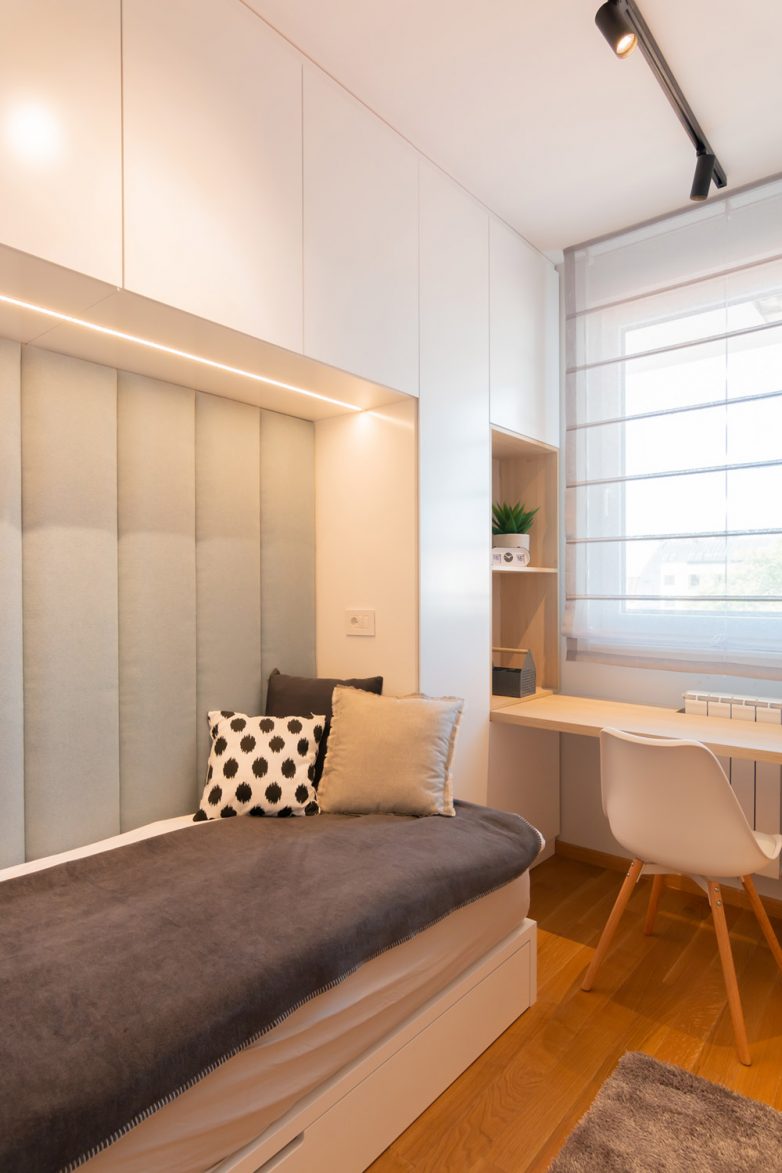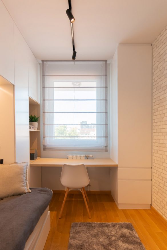 Dečija soba je relativno male površine. U svega osam kvadrata bilo je potrebno staviti radni sto, krevet i orman. Zbog toga je orman stavljen oko kreveta, dok je u nišu postavljen ležaj s tapaciranim uzglavljem. Radni sto je smešten ispod prozora, zajedno sa ladicama i otvorenim policama koje su potrebne za jednog školarca.